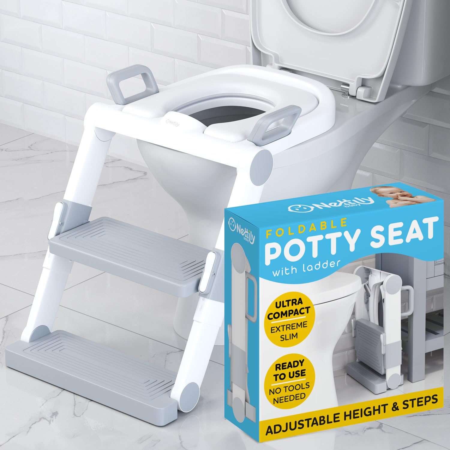 Designed to fit most standard toilet seats with adjustable height and adjustable stairs, the Nettily Foldable Potty Seat with Ladder is easy to set up and store away. No straps, tools, or installation required. Safe for children over 18 months, weighing up to 50 lbs.