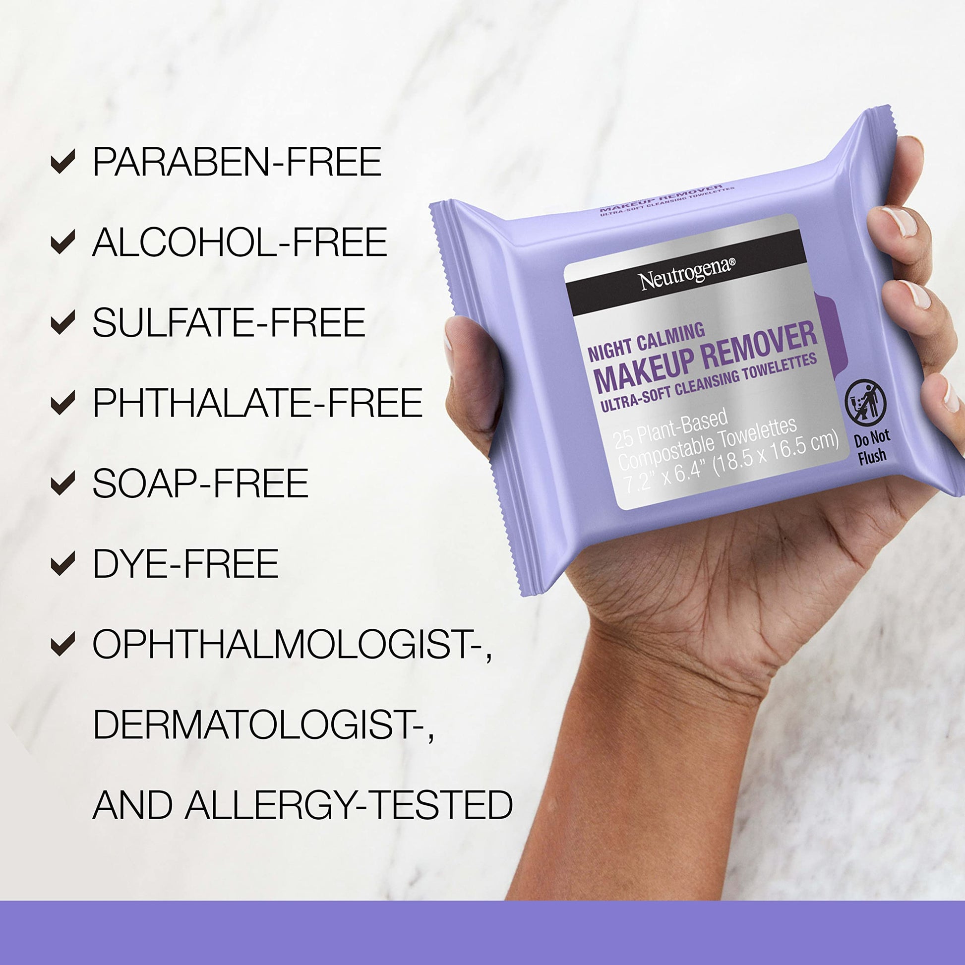 - 25-count of ultra-soft, pre-moistened Neutrogena Makeup Remover Night Calming Cleansing Face Wipes with superior, patented makeup removal and cleansing technology that removes up to 99% of dirt and impurities