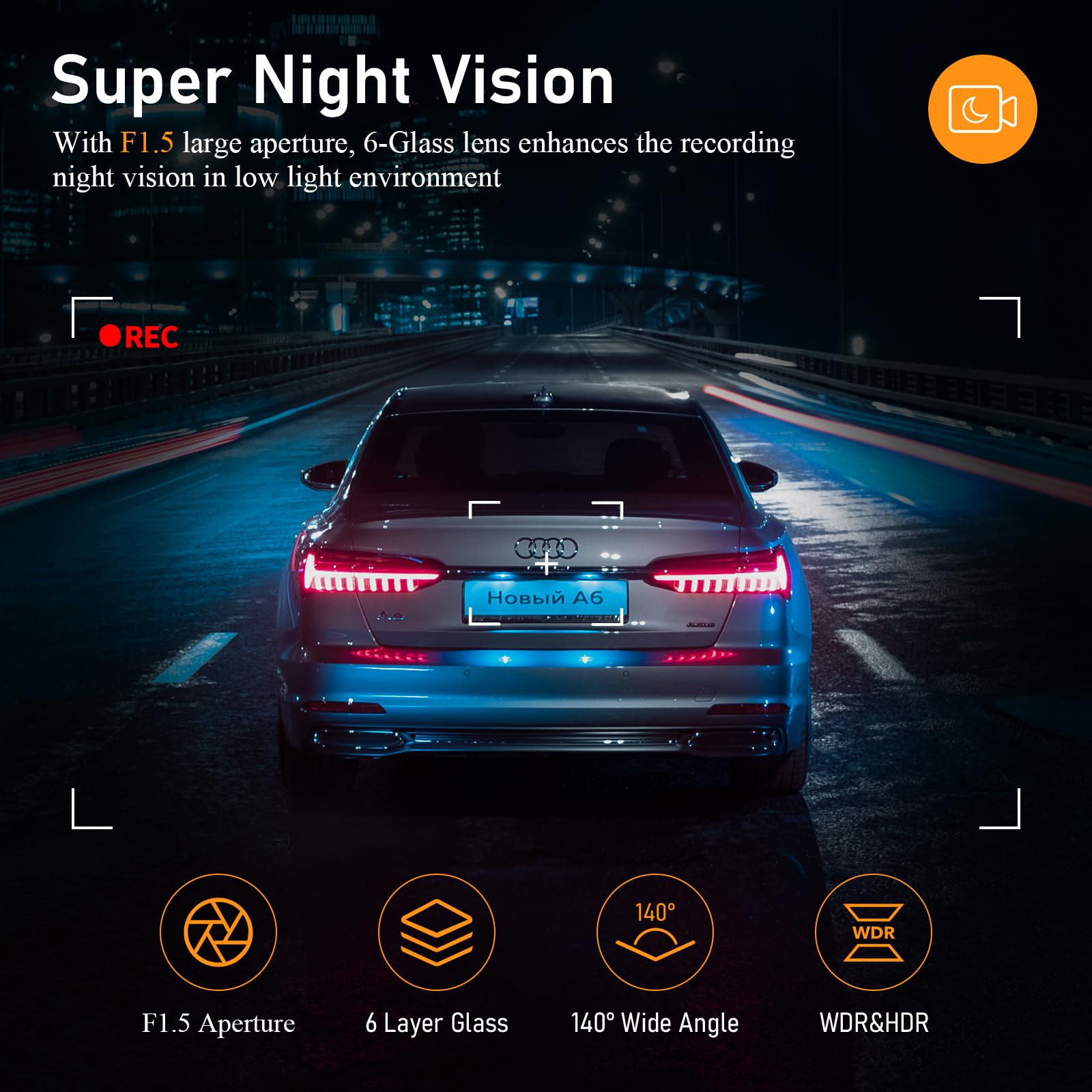 - High-Resolution Night Vision】Experience clear 1080P footage with the dash cam's built-in 140° wide viewing angle lens, 6 layers of high-definition optics and F1.5 aperture. The 1080P super clear image lets you record clear road and car conditions, even during nighttime or low-light conditions, reducing the number of blind spots.