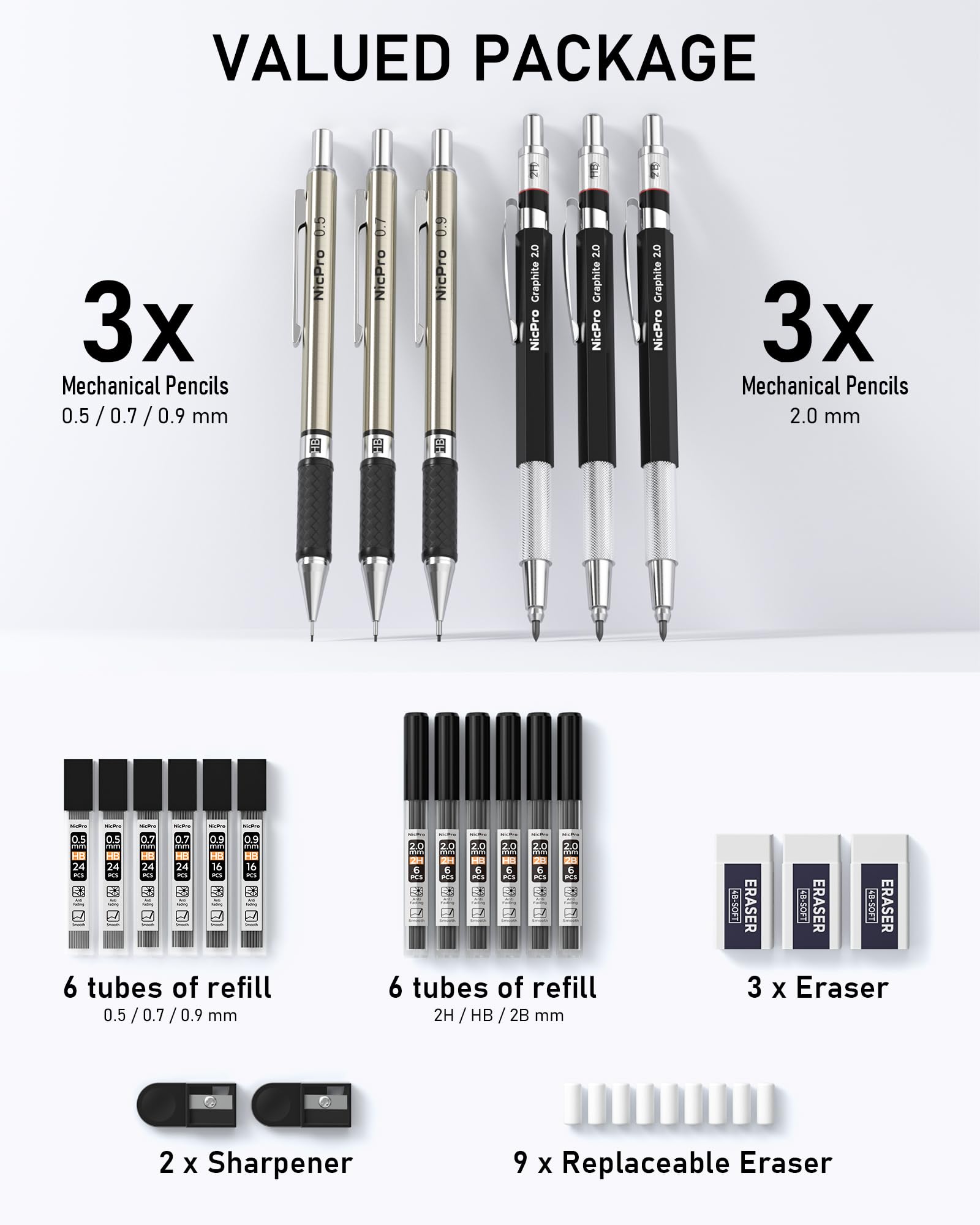 - Value Package :Come With 6 PCS mechanical drafting pencils ,including 0.5 mm & 0.7mm & 0.9mm and 2mm ,12 tubes of refill : 0.5mm & 0.7 mm & 0.9mm ,2.0 mm (2B HB 2H) , 3 PCS of erasers , 9PCS of cap eraser refills, 2 PCS sharpener and a mechanical pencil case