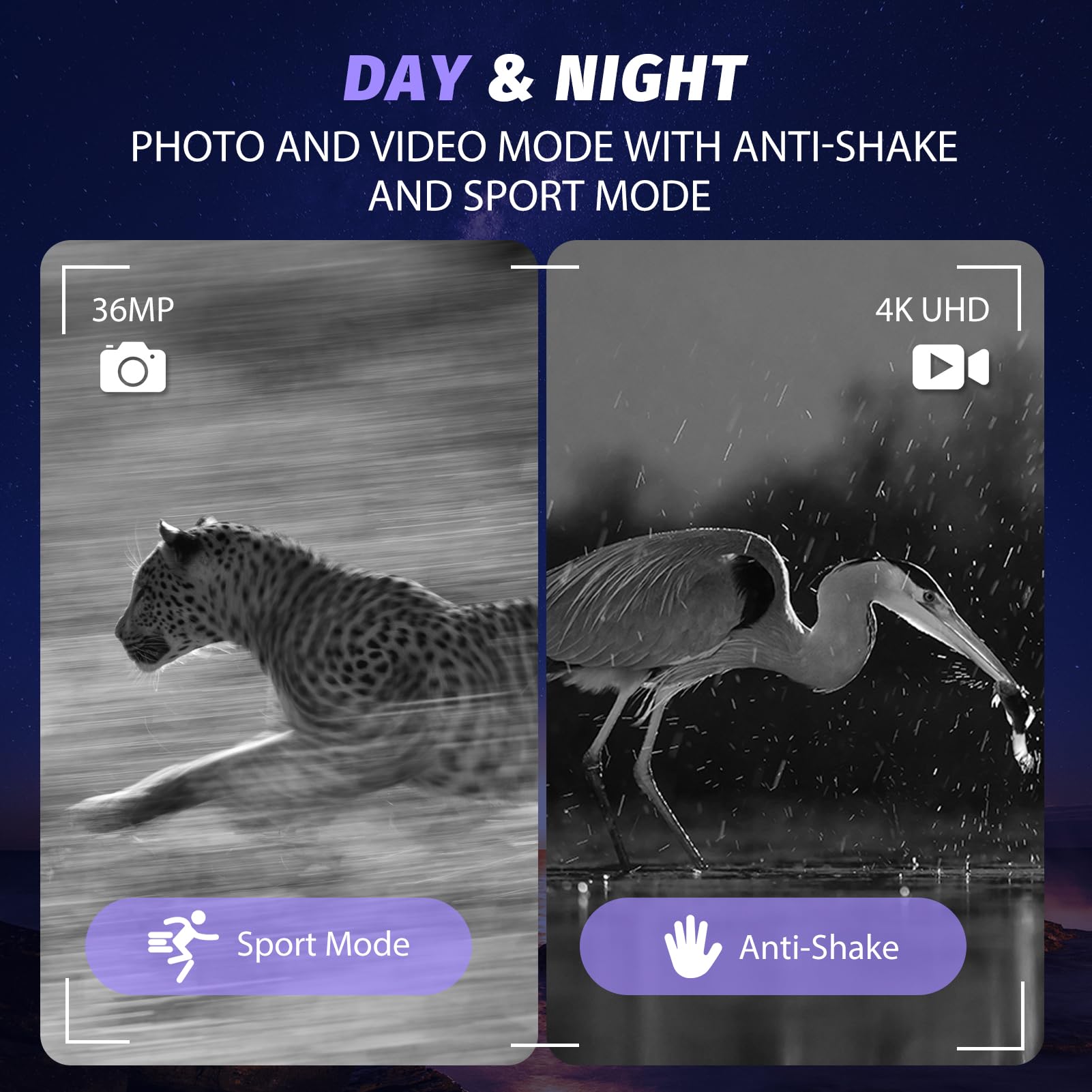 - Full High 4K Video & 36MP Picture: The night vision binoculars achieves 4K HD video and 36 million pixels photos. The motion detection function can be turned on when shooting videos of running animals, and the pictures also have an anti-shake function.