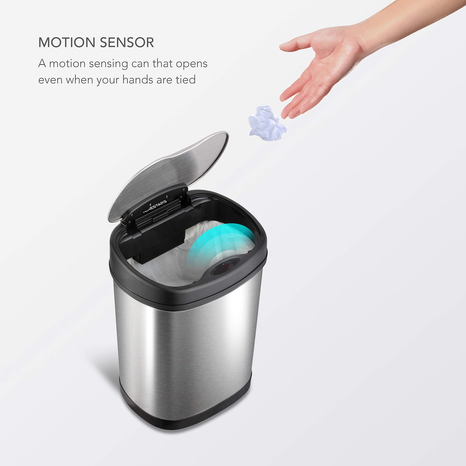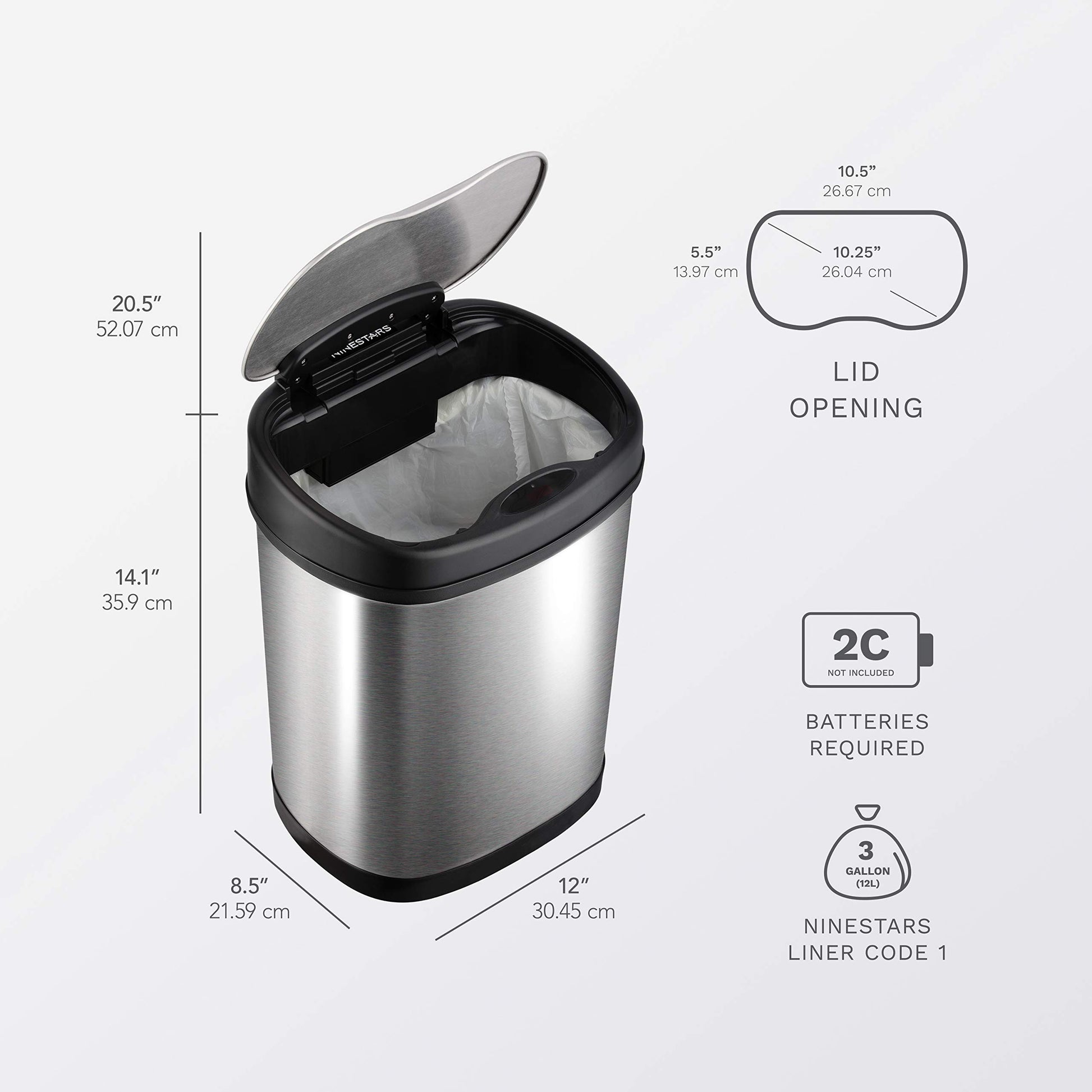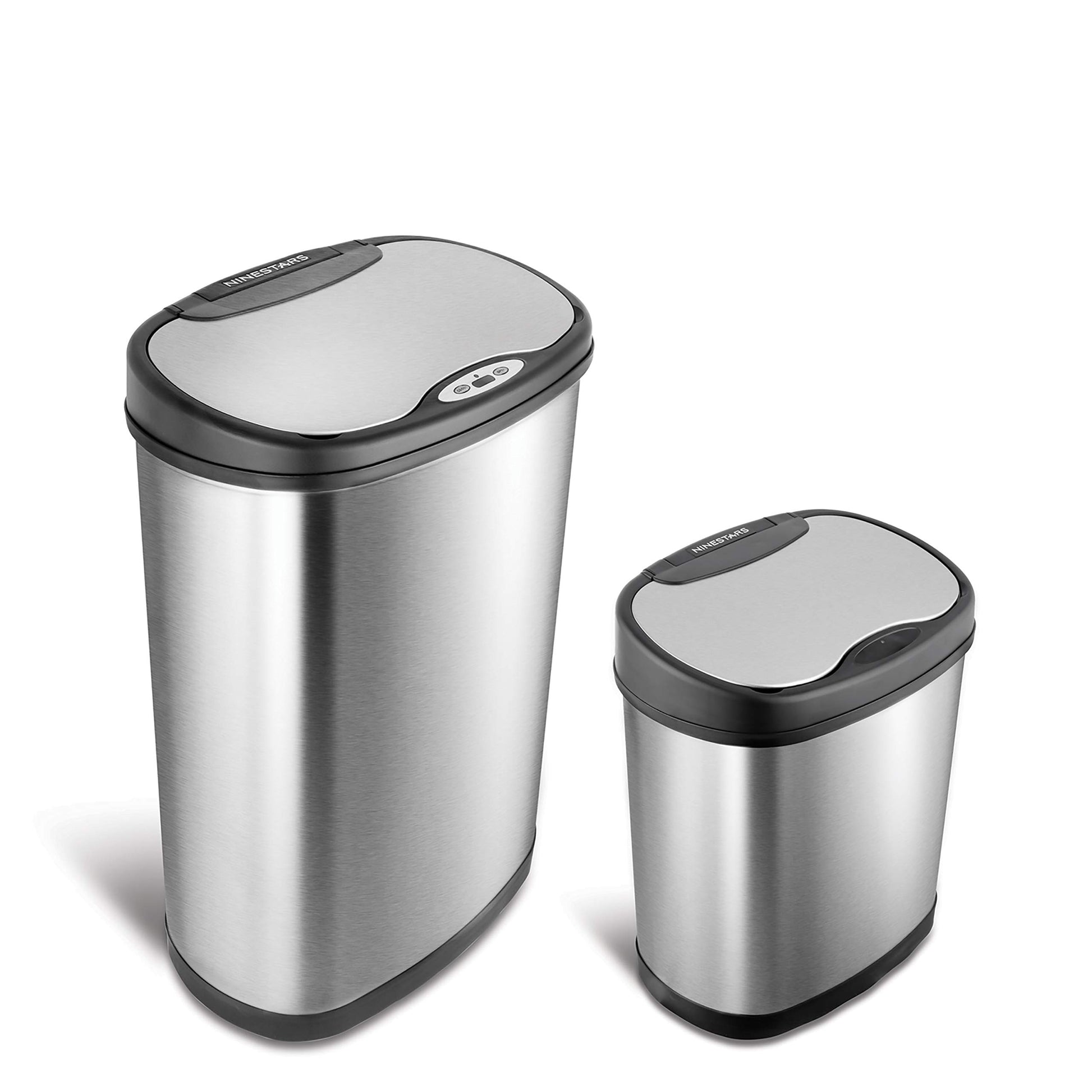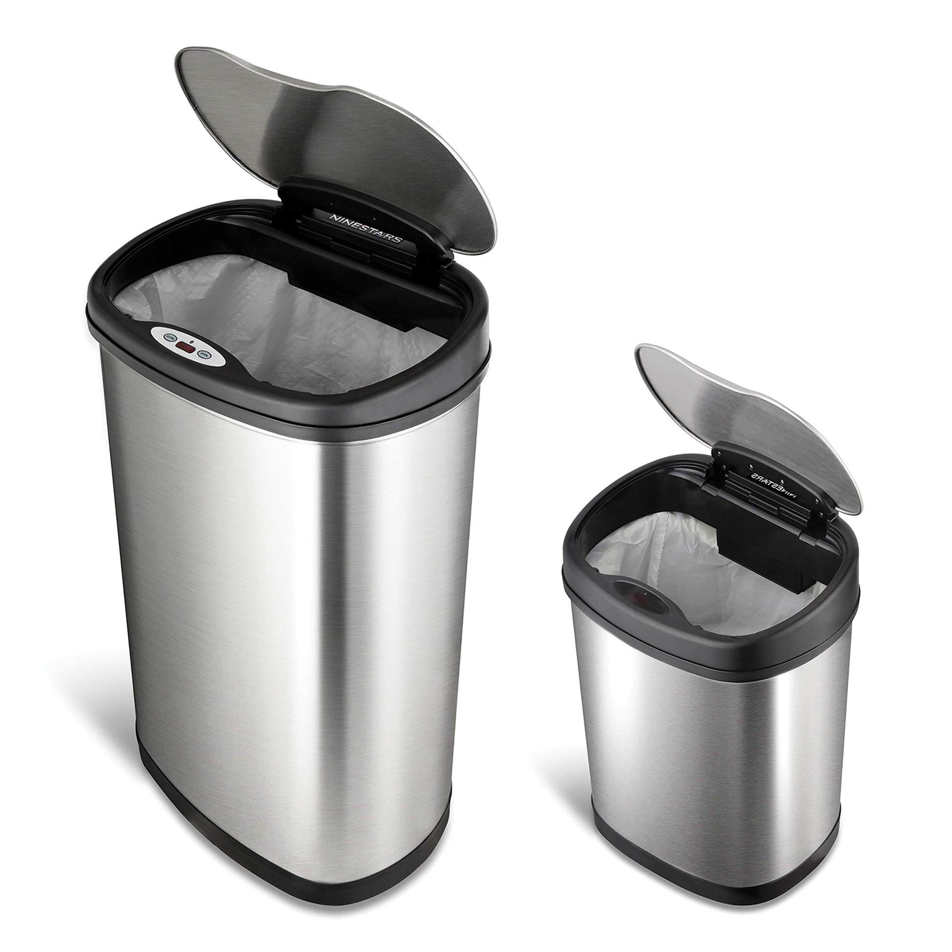 Details: This combo of stainless steel touchless trashcans are designed and engineered by NINESTARS, the world's first legal patent holder. With one kitchen-sized and one bathroom-sized, you can use them in any room you choose, such as the kitchen, office bathroom, dorm room or a kid's room. These two trash cans use the most advanced sensor technology which can be found in all Ninestars trash cans. Pass your hand or debris within ten inches or a 130° angle from the infrared sensor and the lid will automatically open. The lid will remain open if debris or your hand remains within the range of the infrared sensor. After your hand moves away from the lid, it will close automatically. Each can includes a ring liner to keep trash bag from public view for a neat and clean appearance.