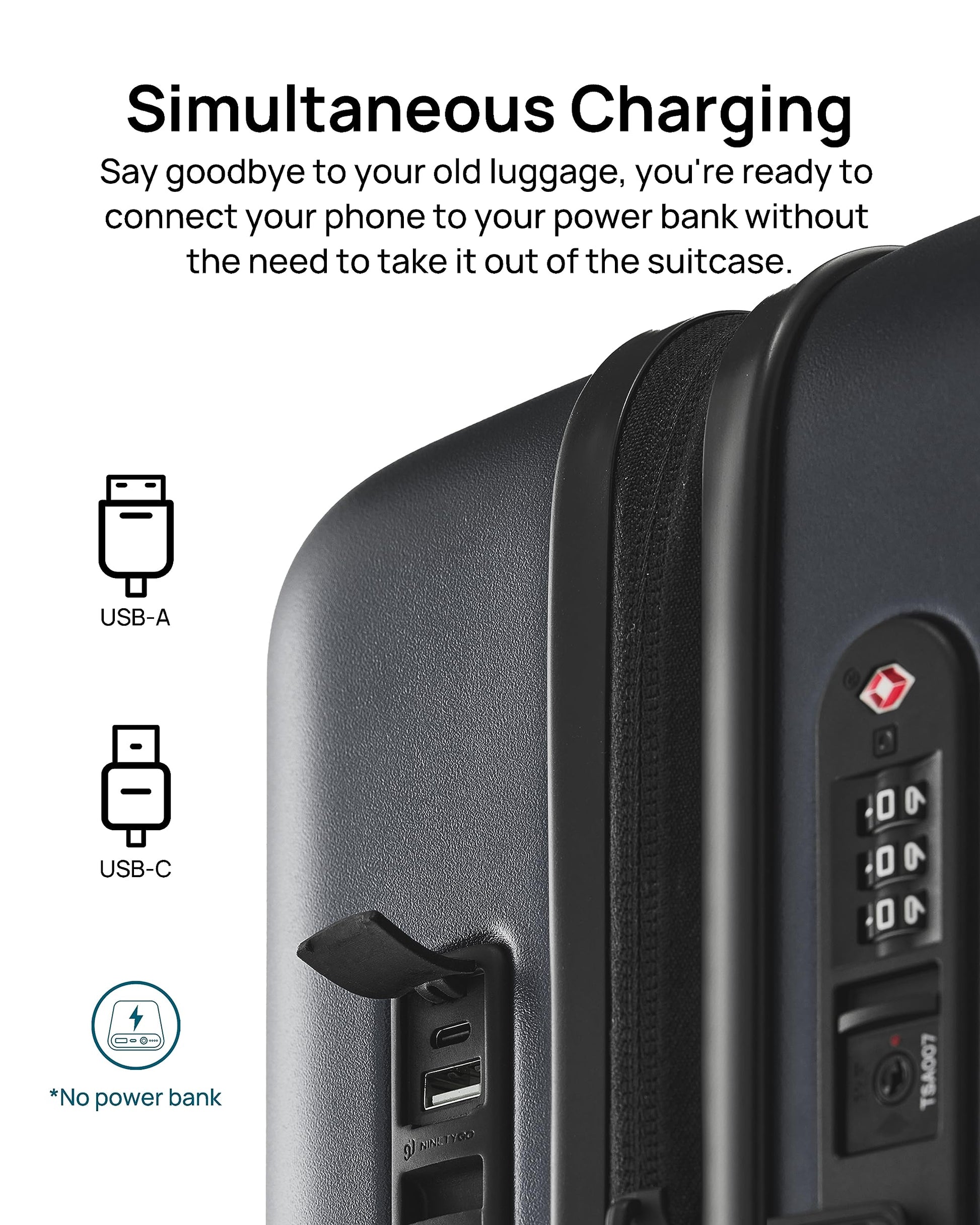 - ใ๐๐๐-๐/๐๐๐-๐ ๐๐ก๐๐ซ๐ ๐ข๐ง๐ ๐๐จ๐ซ๐ญใThe business carry on suitcase maletas de viaje with USB port ensure the devices can be fullly charged, bringing ultimate convenience for your trip, no more worry about battery again. You will never need take your power bank on your hand again. NOTE: Power bank NOT INCLUDE. And 22 Inch Trunk size is not equipped with USB port.