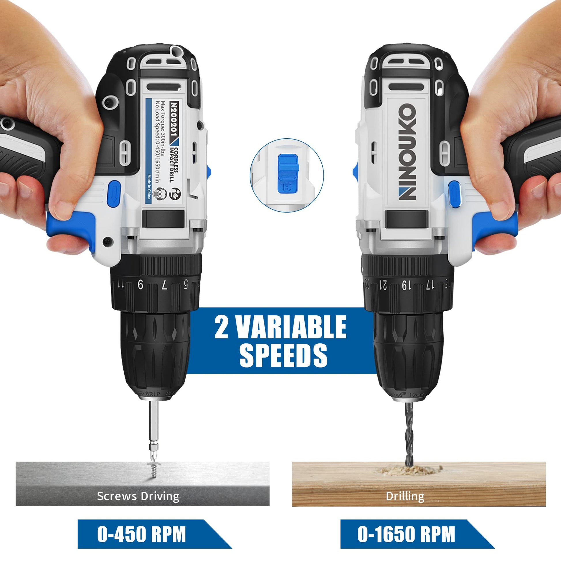 - 【2 Variable Speed & Lightweigh】 20V cordless drill delivers 300 in-lbs of max torque, designed with variable 2-speed settings (0-450 rpm and 0-1650 rpm), for drilling and fastening application on the work site or at home. Ninouko lightweight impact drill is built especially small and compact (only weighs 1.9 lb), so it can be use with ease in tight spaces