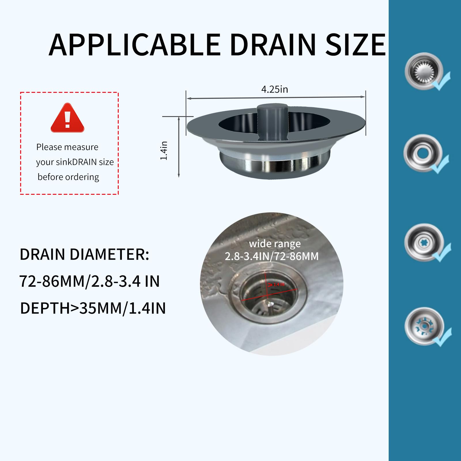 - 【US Standard Kitchen Sink Stopper】-Kitchen sink drain strainer is fit for the drain wide range of 2.8-3.4 inches and the depth is greater than 1.4 inches. Please measure your kitchen sink size before buying.