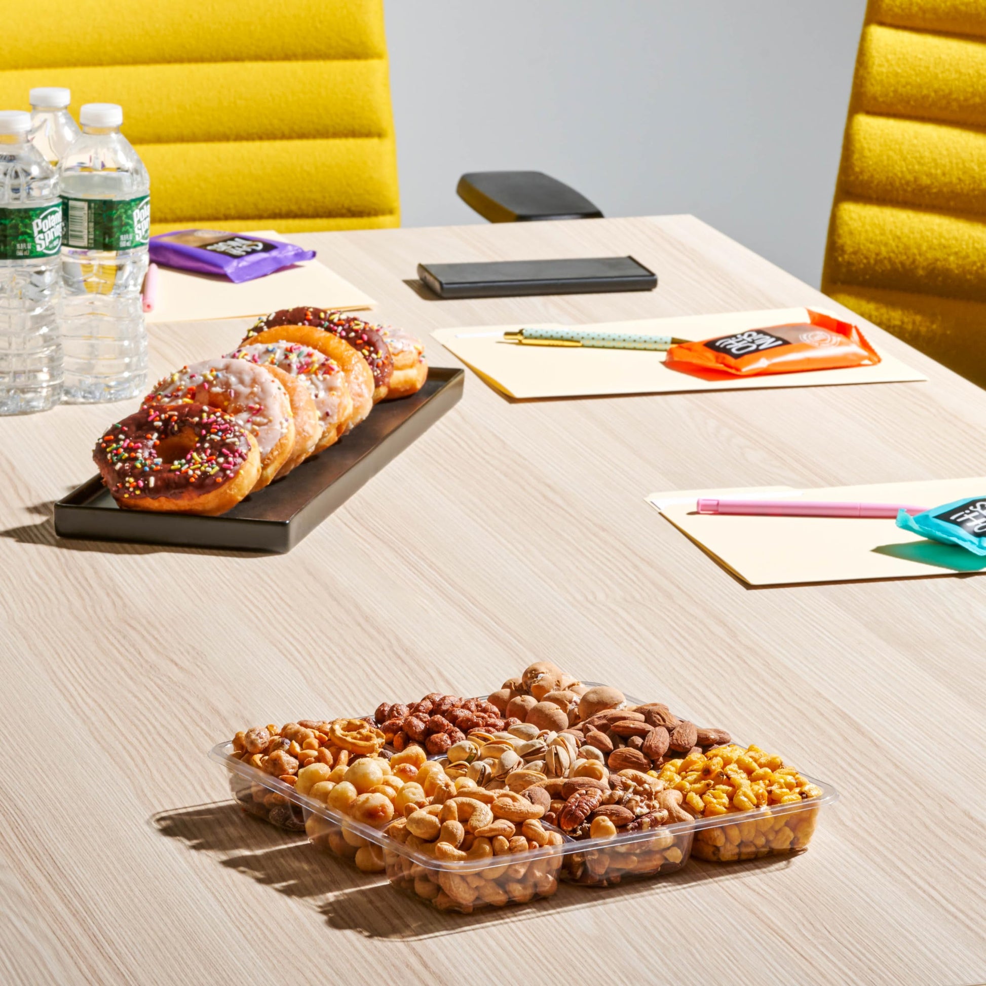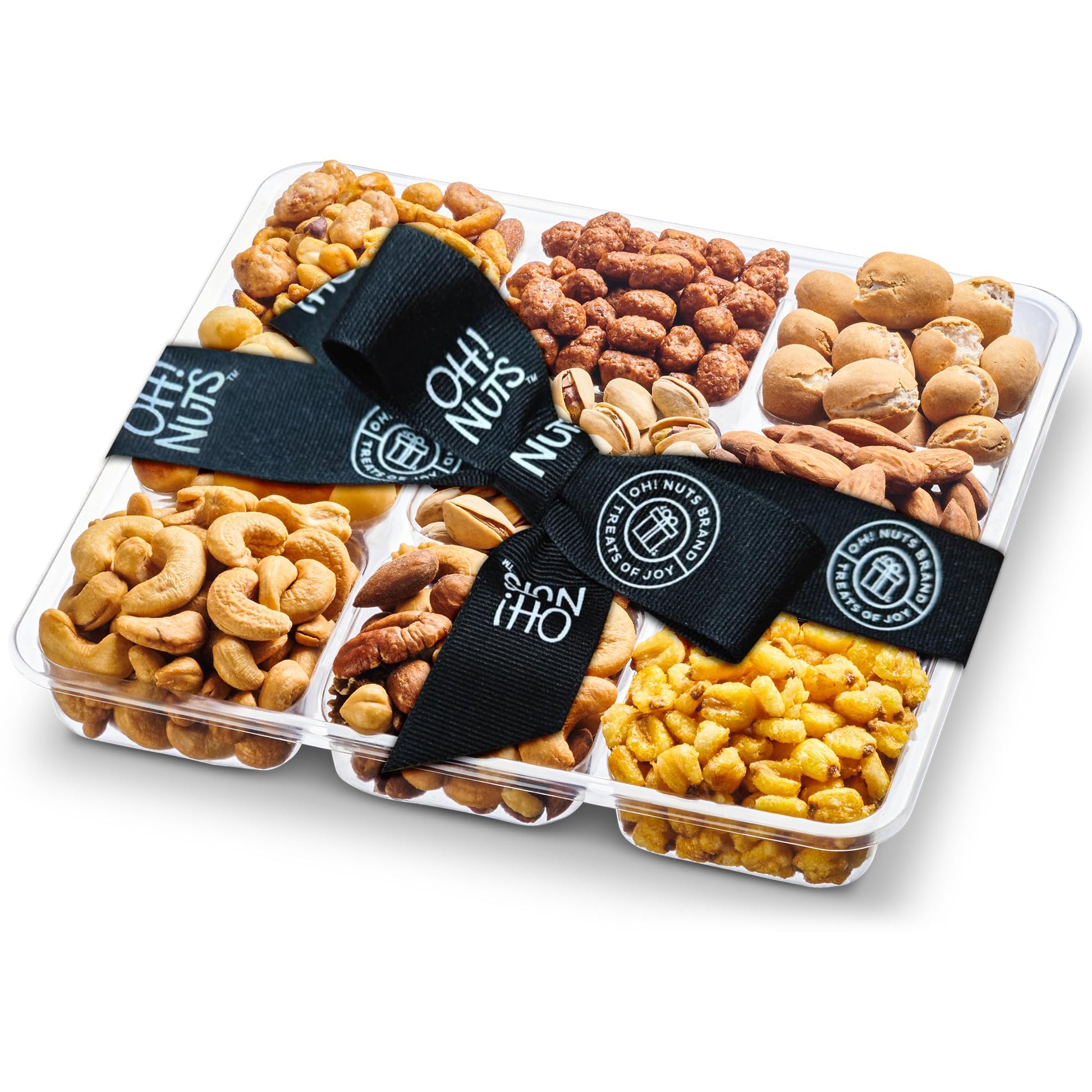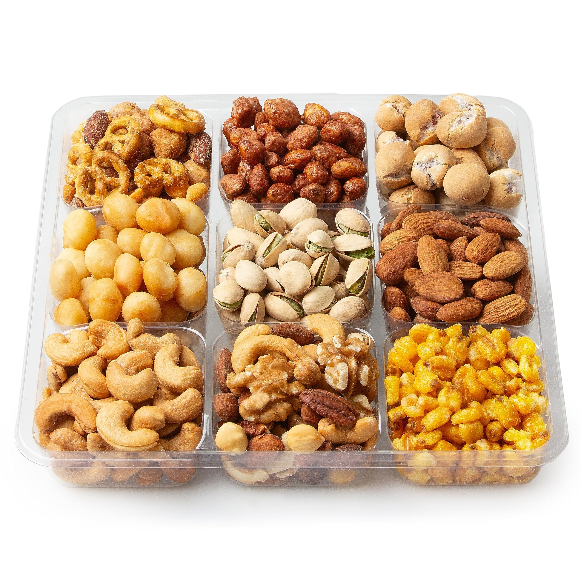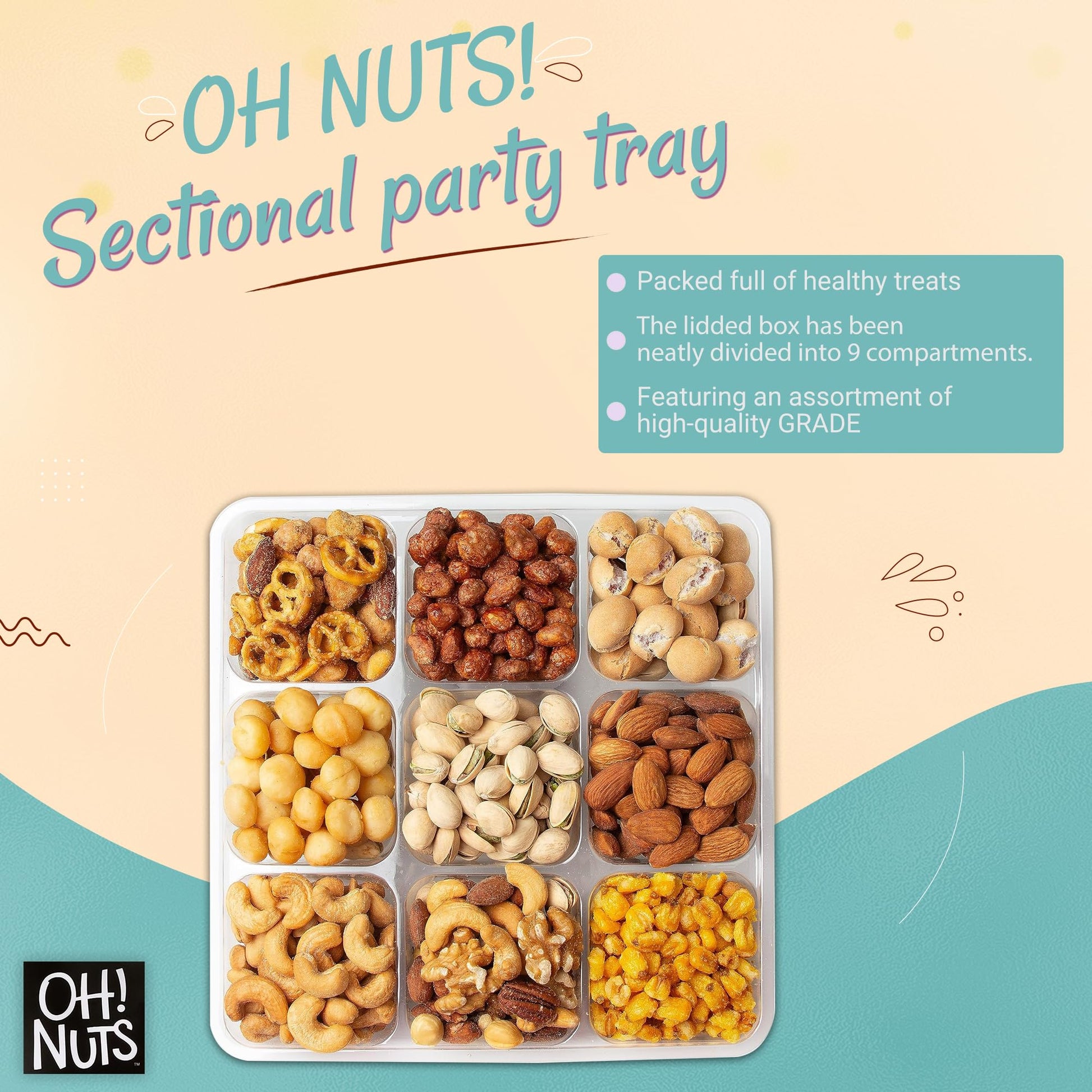 - IRRESISTIBLE SNACKING VARIETY: The Oh! Nuts 9 Section Nuts Square Gift Tray offers an array of premium nuts and snacks, from Honey Glazed Peanuts to Sweet & Savory Bar Mix, Toasted Salted Corn, and more. This variety ensures that every snacking desire is satisfied, making it a perfect choice for all occasions.