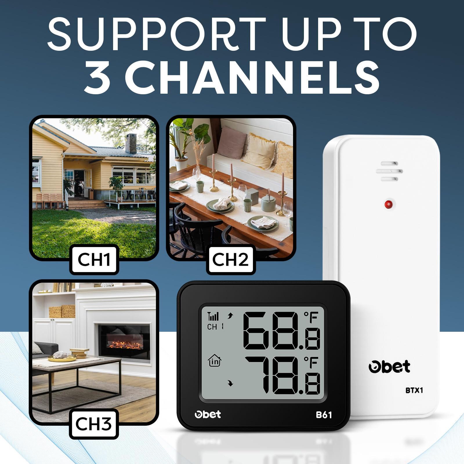 - Wide application: Inside outside thermometer wireless can connect up to three sensors, so you can monitor the temperature in different places at the same time, such as the living room, bedroom, baby room, kitchen, garage or garden.