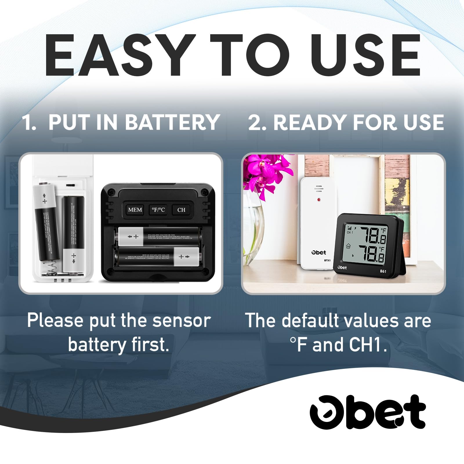 OBET Indoor Outdoor Thermometer Wireless Outdoor Thermometer Digital Thermometer Gauge 500Ft Remote Temperature Monitor for House Home Room Patio B61-Black