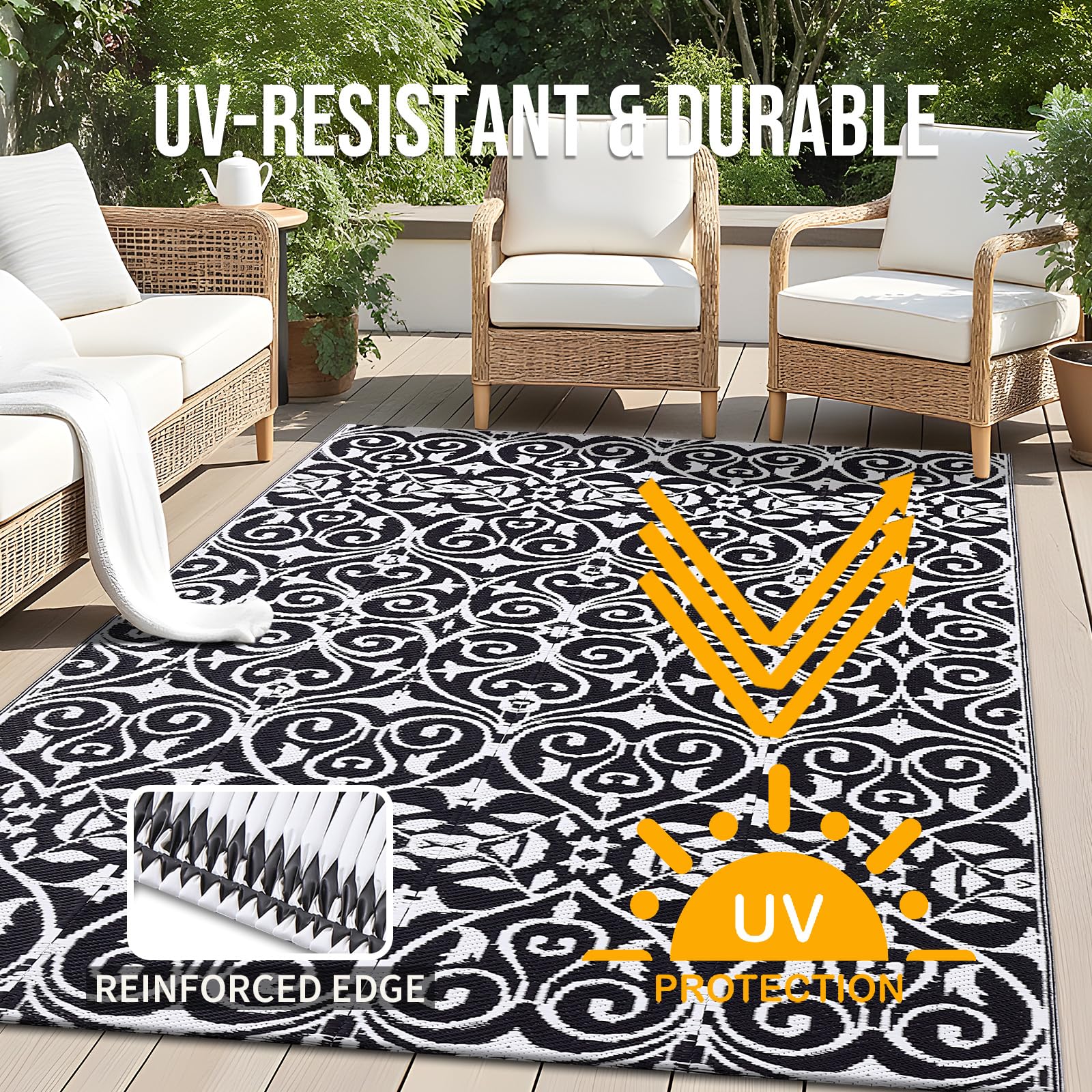 - UV-Resistant & Durable: Equipped with a UV-protective layer, this outdoor patio rug resists fading, keeping its vibrant colors intact even under prolonged sun exposure. Reinforced edges add extra durability, making it a reliable choice for all-weather use.