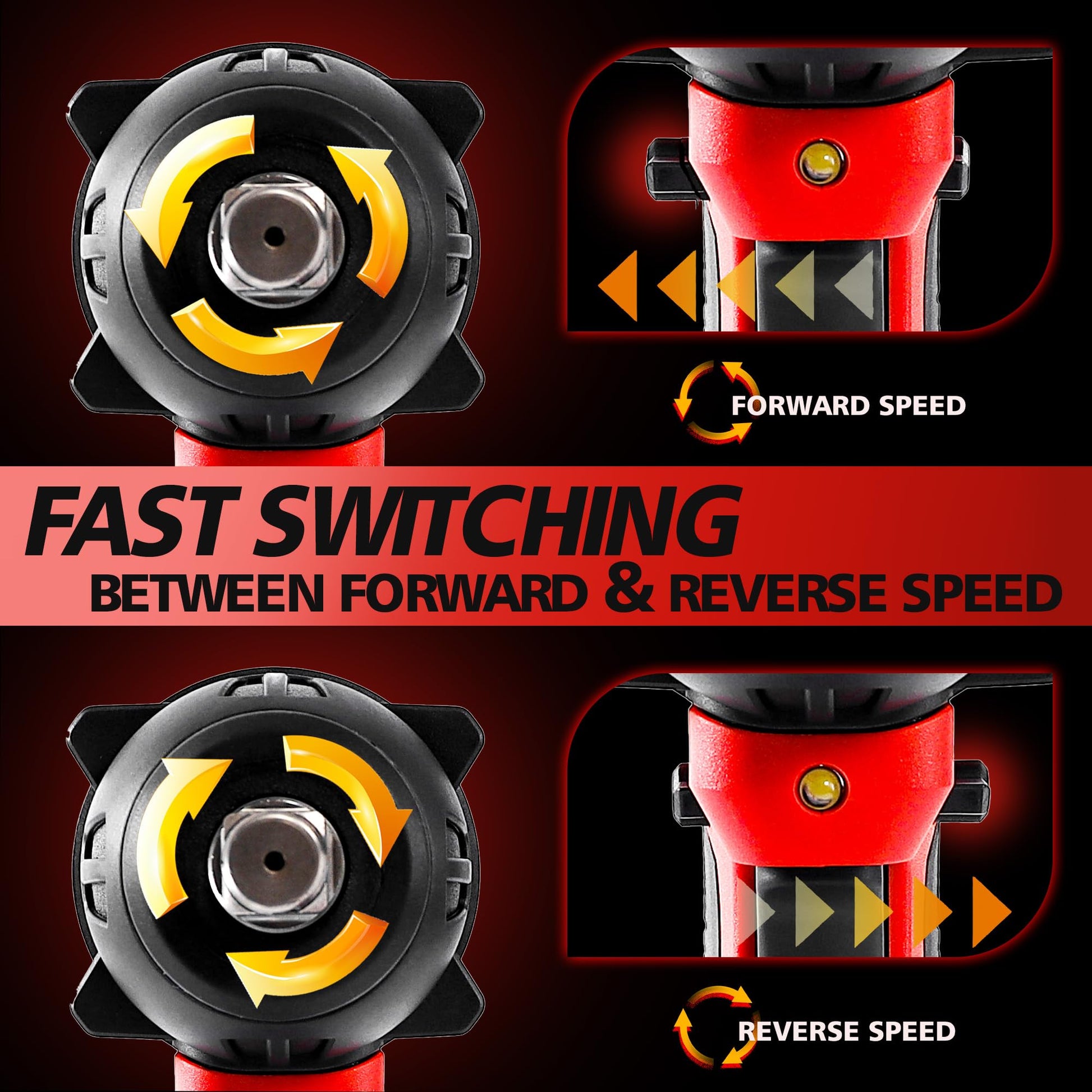 - 4.【Three Speed Gears And Premium Brake-Stop】When in Forward-Mode,Our power impact wrenches has three speed gears, which you can control through the buttons on the fuselage, When in Reverse-Mode, You press the "switch button" and when the "automatic stop" indicator lights up,the brake-stop will active.It will backs off the speed and the torque once a nut or bolt breaks loose, to protect the nut/bolt from flying to nowhere to catch.