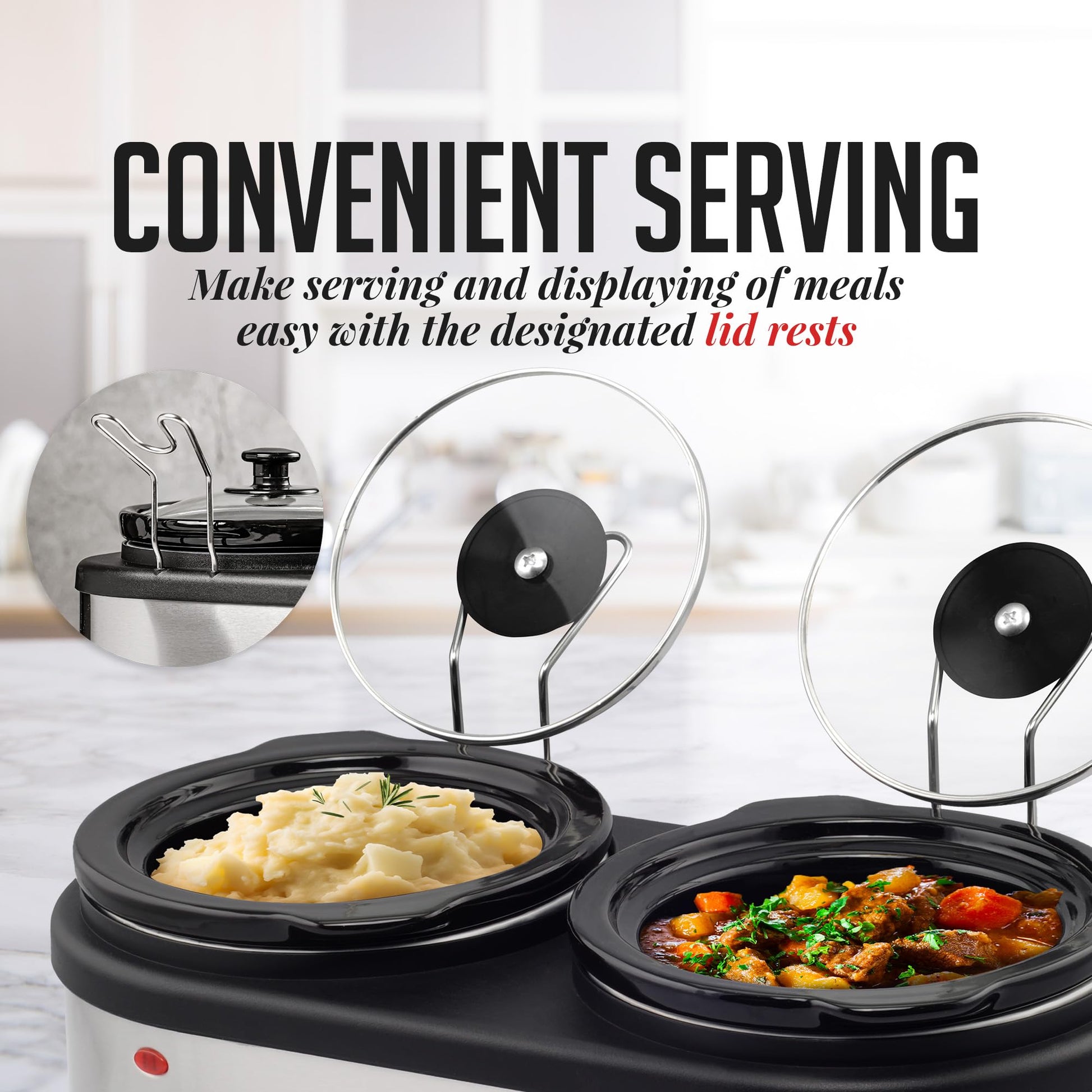 - COOK 2 DISHES IN 1 APPLIANCE – Has 2 independent stations; each with 1.5 quart ceramic pots (3 Quarts in Total) which allows you to slow cook two different dishes at the same time. Ideal for making hearty stews, oatmeal, ratatouille, pulled pork, chili, sloppy joes, hummus, melty dips, peach cobblers, soups and more.