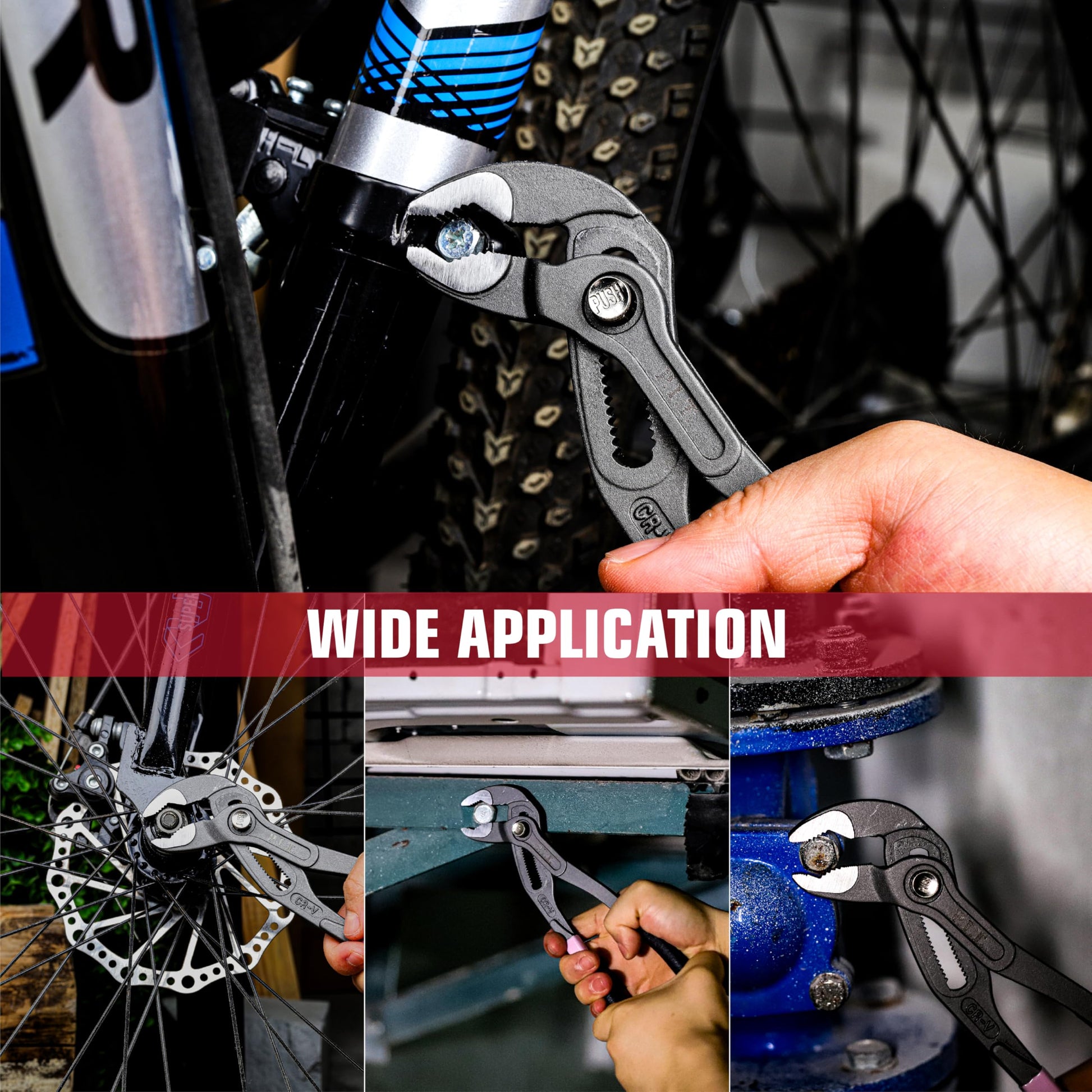 - Heavy Duty Construction: Water pump pliers are typically made from high-quality steel, featuring a strong, durable design with heat treated and blackening surface. It will ensure higher hardness, better clamping force, toughness and durability. Hardened cutting edges for increased cutting ease, and fine polishing for corrosion resistance They have adjustable jaws that allow users to grip objects of various sizes securely