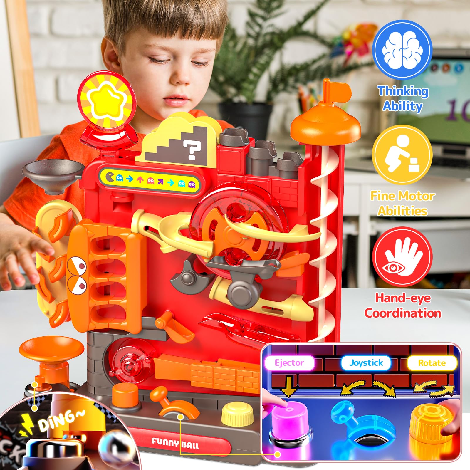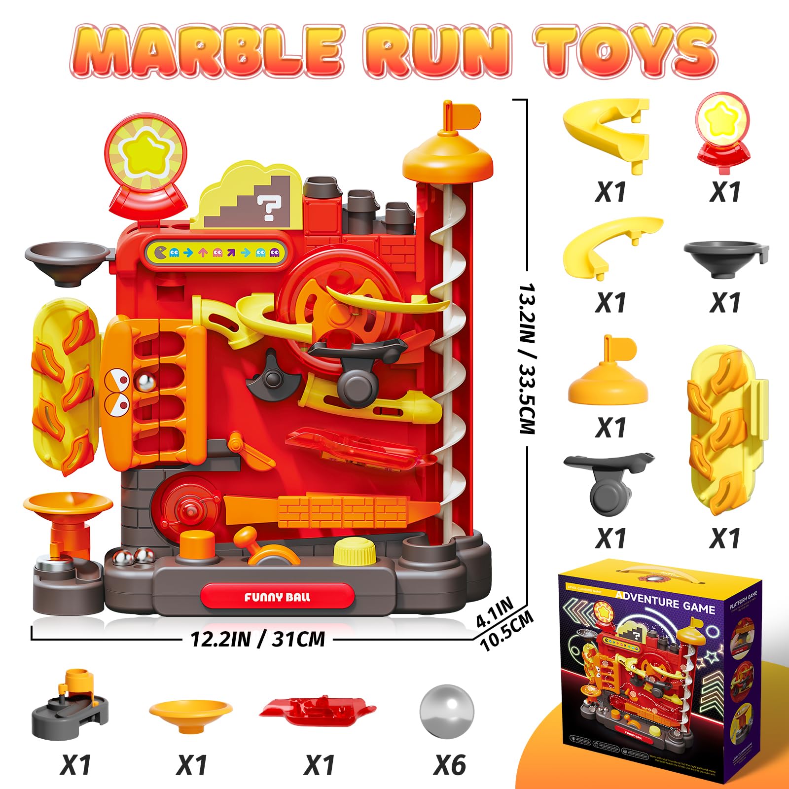 - Toys for Ages 5+: Operate a dozen obstacles by controlling three buttons. Work your way up, but don't let the marbles fall. Marble runs for kids 8-12 designed to improve hand-eye coordination, problem-solving, and spatial awareness. This toy will bring joy and build confidence as they navigate the marble through different obstacles and challenges