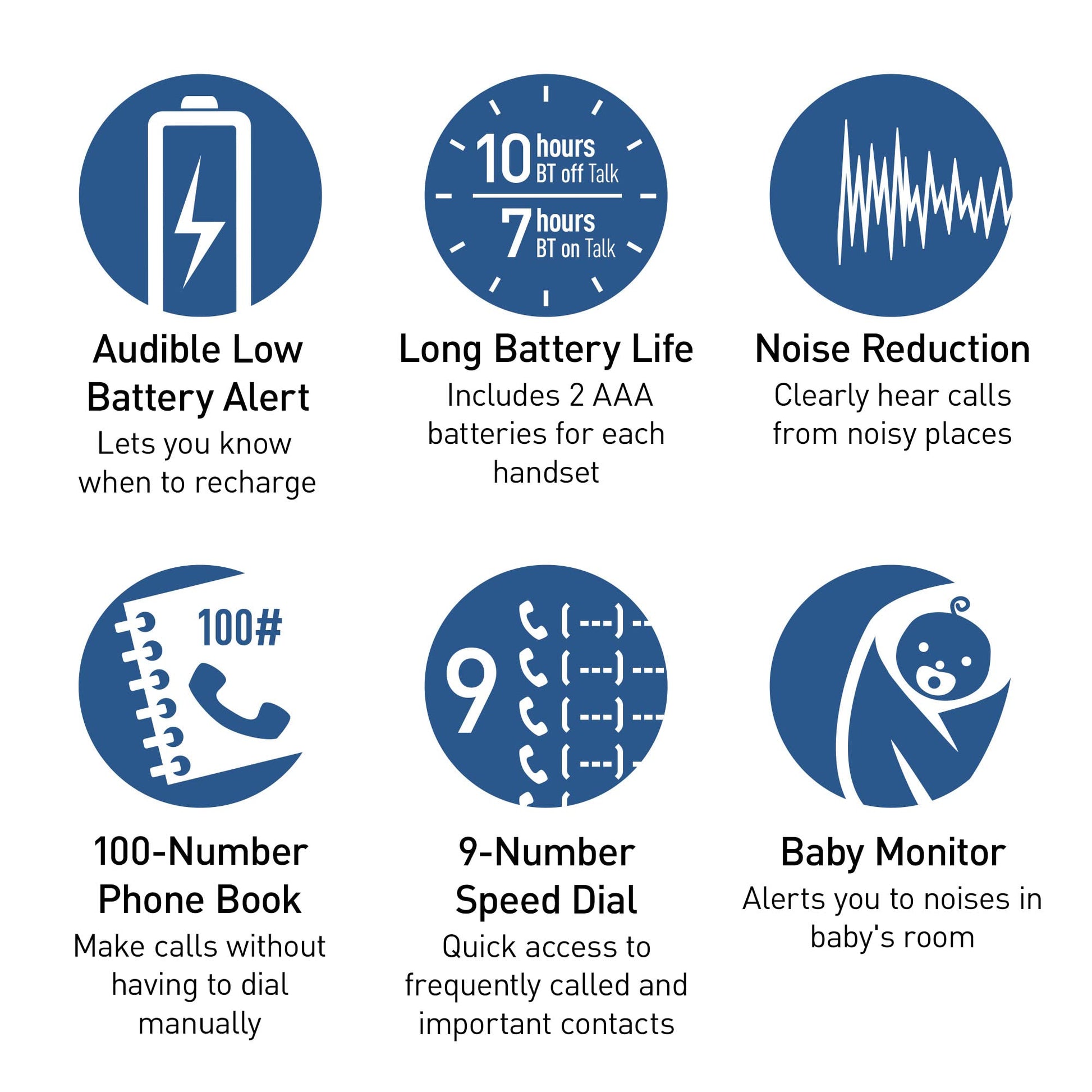 - Expandable Phone System: Add up to 4 cordless handsets (sold separately) to grow your phone system for home or business; long-life battery (up to 10 hours of talk time Bluetooth off / 7 hours ON)