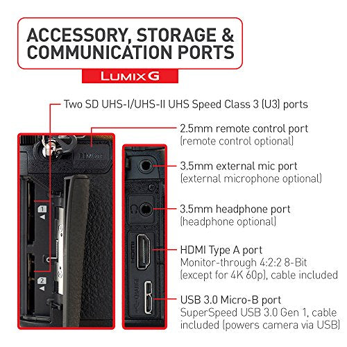 Details: The professional-grade Panasonic LUMIX 4K digital camera DC-G9 accepts over 30 LUMIX and LEICA DG lens options built on the next-generation interchangeable lens camera (ILC) standard (Micro Four Thirds) pioneered by Panasonic. With a durable, magnesium alloy body that’s splash/dust/freeze proof, the mirrorless design enables a lighter, more compact camera body that can go anywhere you can. Cutting-edge features include 4K 60P (4: 2: 0 8-bit) and 30P (4: 2: 2 10-bit) internal recording, 5GHz Wi-Fi andBluetooth for fast connection and image transfer, lightning fast DFD focusing, 5-axis Dual I. S 2. 0 stabilization and exposure technologies not possible with traditional DSLRs. With the exclusive LUMIX 4K PHOTO (8MP, 30/60 fps) and brand new 6K PHOTO mode (18MP, 30 fps), simply pause that perfect moment from video to produce printable high-resolution photos. A high-resolution 21mm, 0. 76x OLED eye viewfinder (3680k-dot) matches up to exactly how you intended to see the image even under direct sunlight. For connectivity convenience, The G9 includes a full size (type A) HDMI terminal with cable lock, Twin SD card slots (UHS-II U3 compatible) and 3. 5mm microphone & headphone terminals. Dust reduction system: Supersonic wave filter.