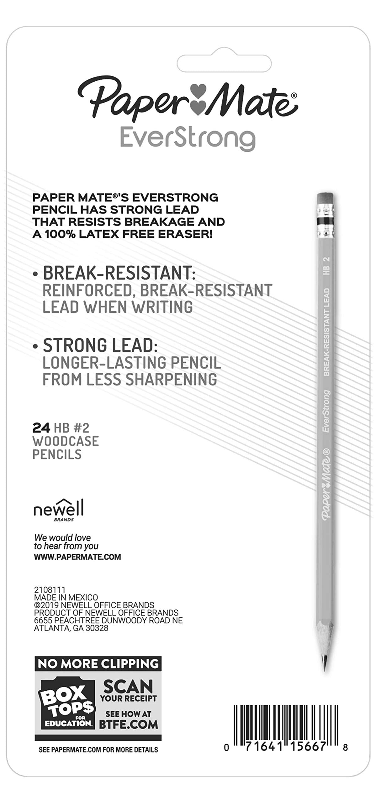Details: Get more out of your pencil with Paper Mate EverStrong #2 pencils! These woodcase pencils feature reinforced, break-resistant lead when writing, so they need less sharpening and last longer. The wooden pencils also feature 100% latex-free erasers.