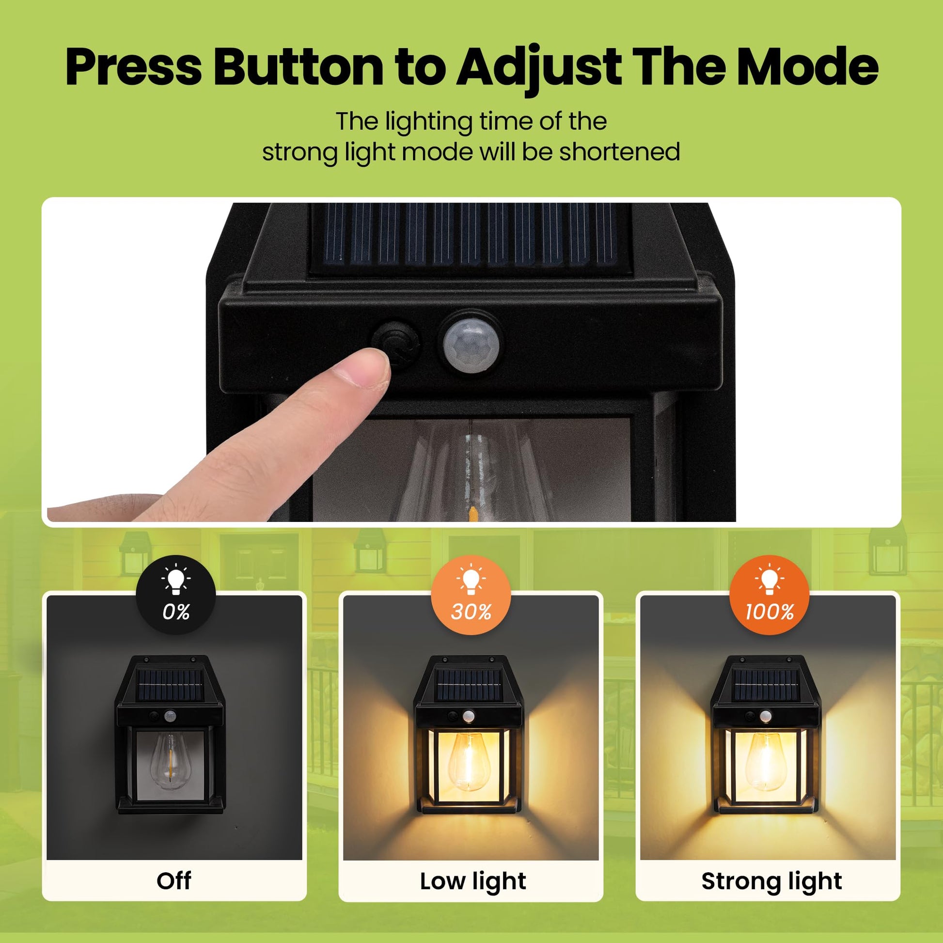 - 【Press BLACK Button to Adjust Mode】Mode 1: Press and hold for 1 second to activate Motion Sensor Mode. Mode 2: Press twice to turn on Sensor Mode + Continuous Low Light mode. Mode 3: Press three times to turn on low light mode all night