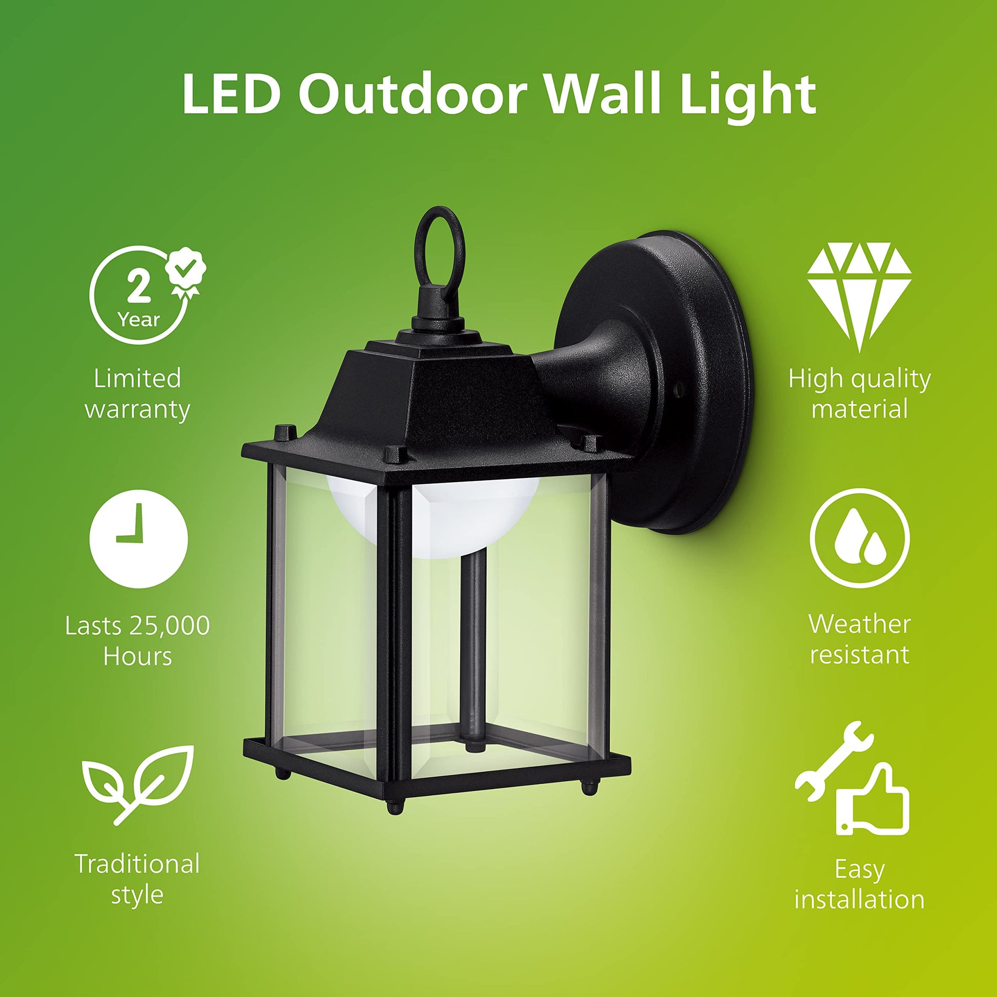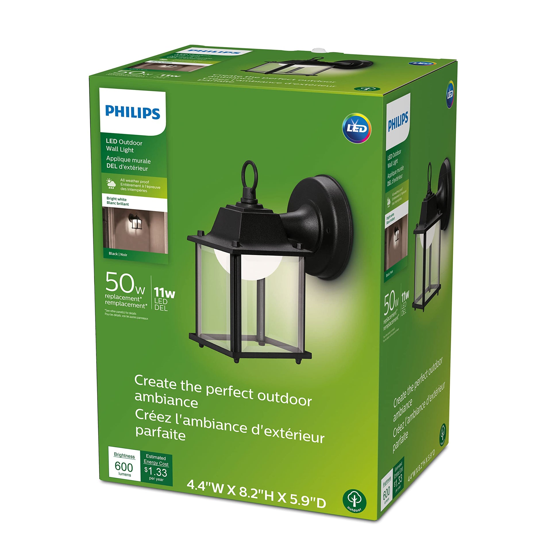 Details: The Philips Outdoor Wall Lantern versatile square design complements a variety of exterior decor styles. The matte black aluminum alloy construction is durable and weather resistant effectively preventing this fixture from rust or corrosion. The integrated LED bulb is maintenance free with no bulbs to replace and easy to install. Enjoy illuminating your space with the equivalent of 50W or 600 lumens of bright white light to create the perfect outdoor ambiance.