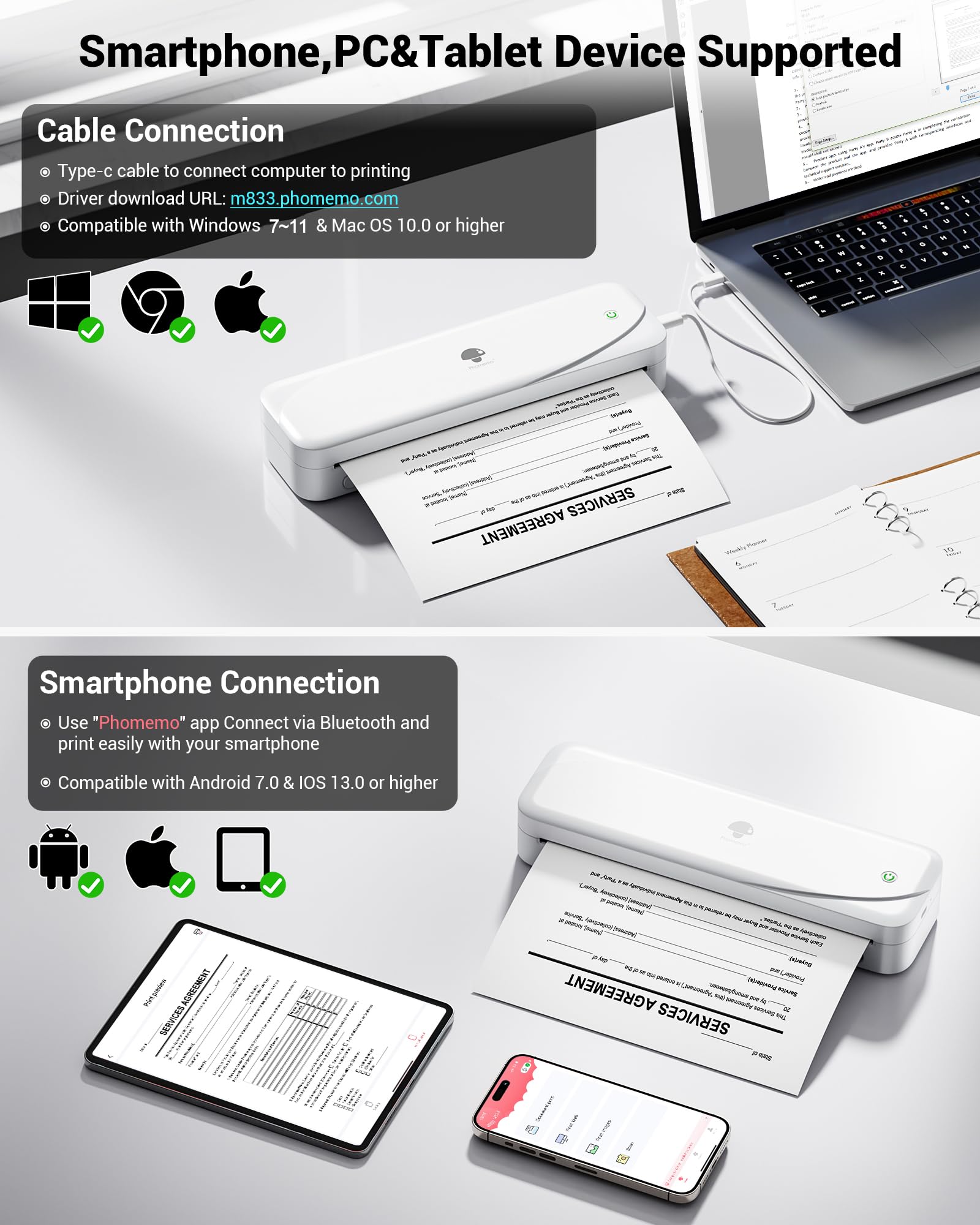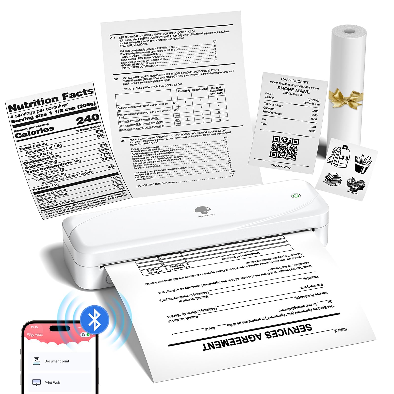 - Inkless Printing - M833 wireless portable printer uses advanced thermal printing technology, Don't require ink, toner, no ink-related blockages, and cleaning issues. NOTE:This Inkless printer is only supports thermal printing paper, not support regular copy paper