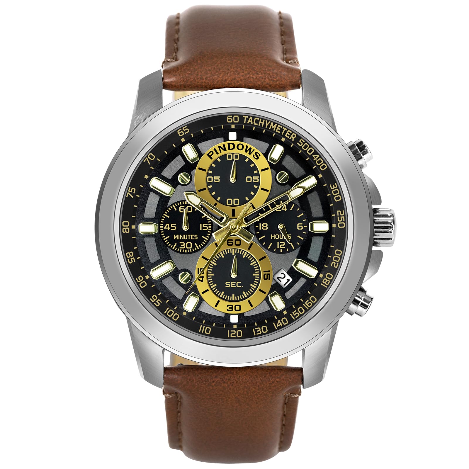 - 【Stylish Design】Elevate your look with the PINDOWS men's wrist watches, featuring a sleek stainless steel case and genuine leather band, perfect for both business and casual settings