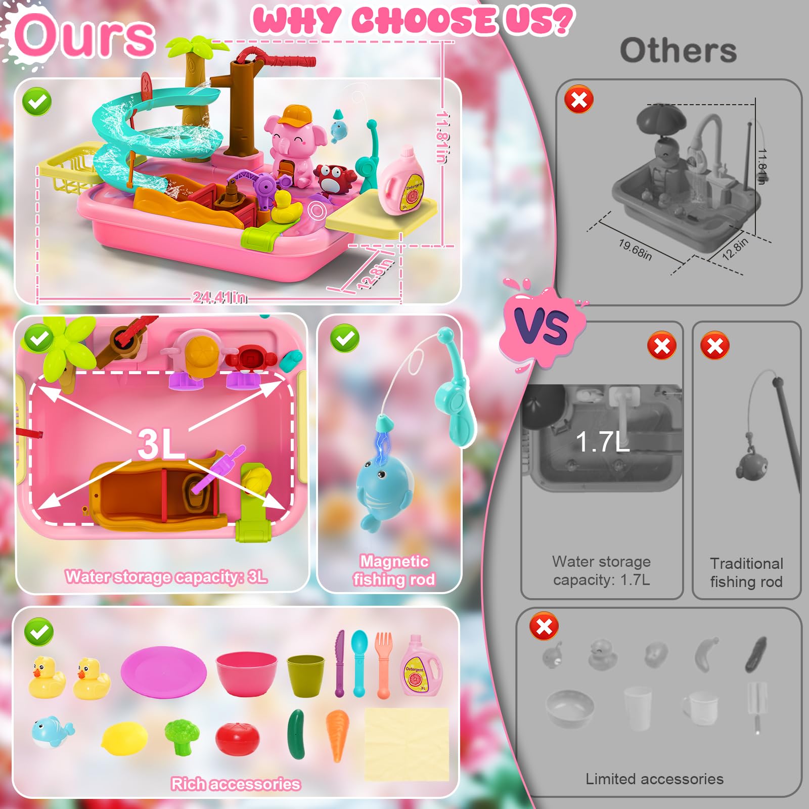 - Larger Playing Area and Water Storage Capacity with Richer Water Play Accessories Than Other Brands for More Kids & Parents to Play Together - The size of the Surelect kids sink with running water is 24.41” x 12.8” x 11.81”, with a water storage capacity of no less than 3L, which is larger and deeper than other brands. Our large-sized toddler sink toy, with 41pcs water play accessories, offers enough space and multi-functional play for parents and kids to enjoy together, acting as a communicative link between them.