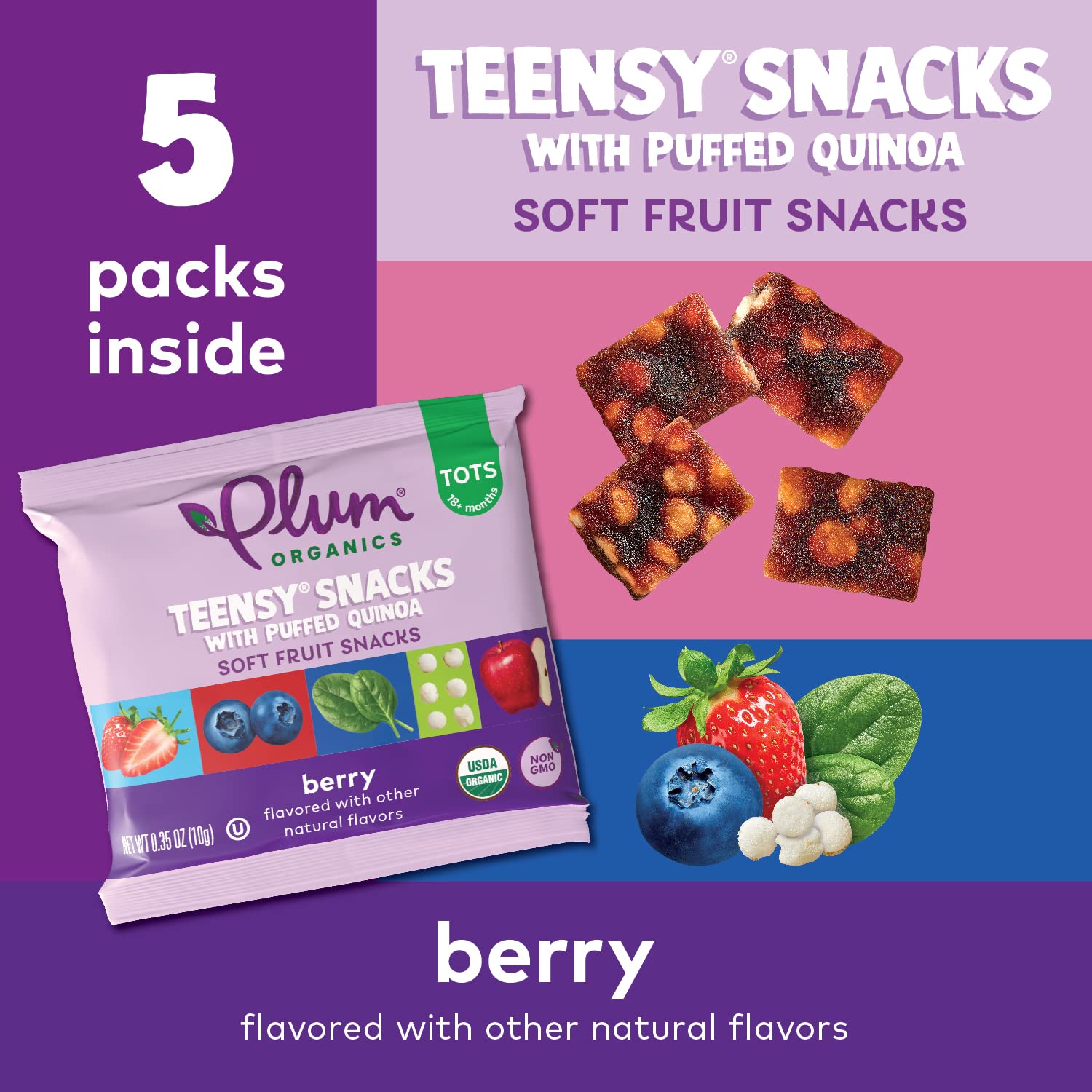 Details: Teensy Snacks for a Teensy Tot. Plum Organics Teensy Snacks are soft fruit snacks made with organic fruit, sized perfectly for little mouths to chew to encourage eating independently. Made without high fructose corn syrup, these organic fruit snacks are available in three flavors - peach, berry, and mixed berry - and are made with only non-GMO, organic ingredients for an organic toddler snack that your little one will love. This multi-pack includes 8 boxes of 5 individually wrapped packs for a convenient snack on the go.
