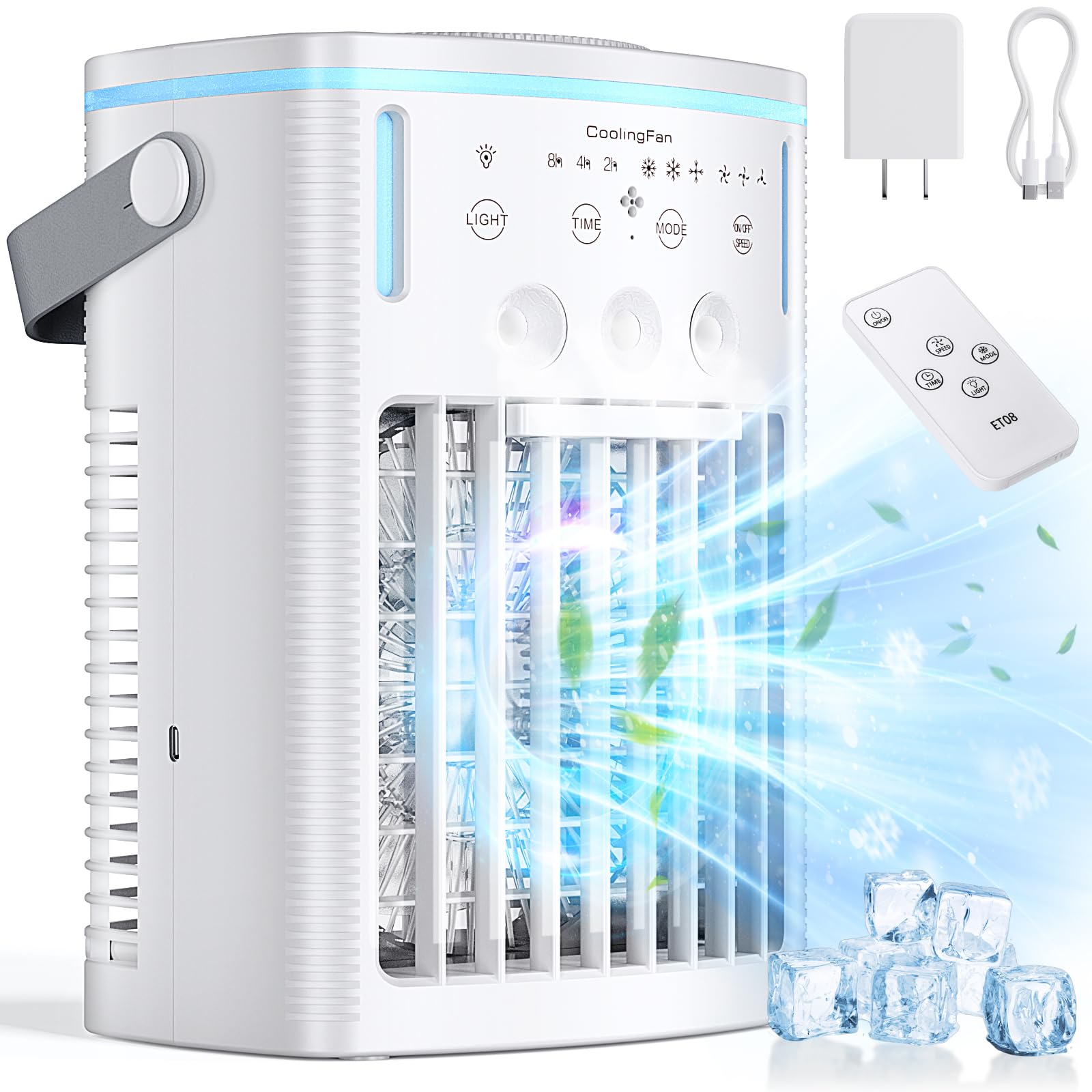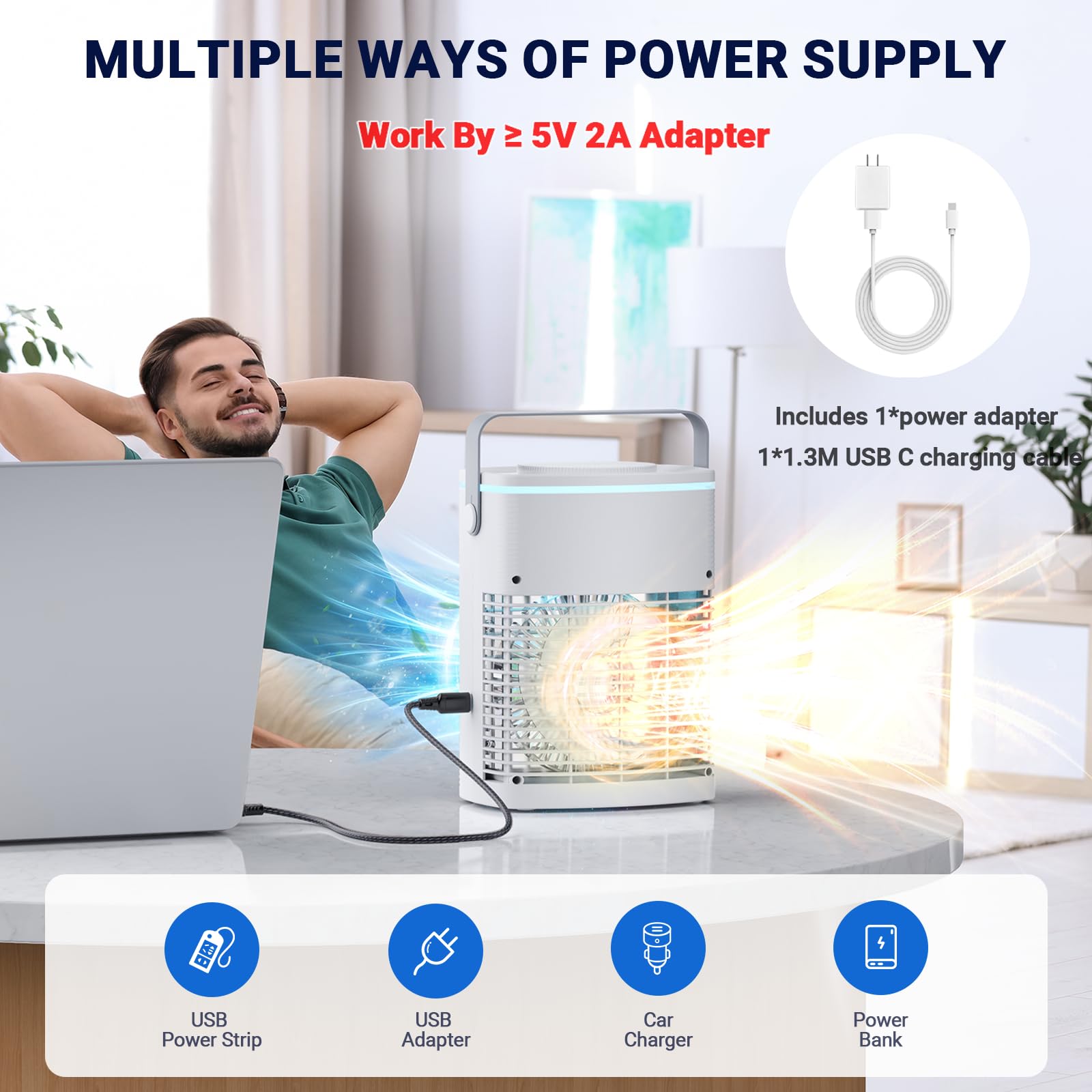 - ❄️【Multi-functional and Ultra-quiet】Four in one design, it is a cute small personal air cooler, a desk fan, humidifier and LED night light. Ac fan is built-in 7 soft colors night light, You can choose to turn it on or off by touching the "LIGHT" button. Moreover, this misting fan is low noise (45-50 decibels) and will not disturb your life, work or sleep. Equipped with USB-C charging port, it can be powered by mobile power, laptop, adapter, computer, car charger.(Note: We provide you with original charger and charging cable)