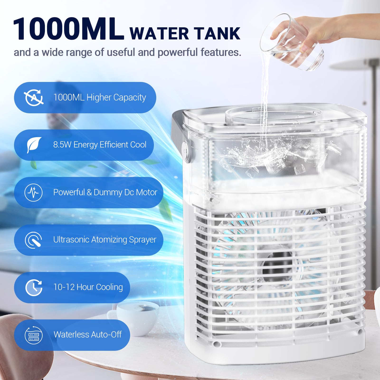- ❄️【Smart and Efficient, Energy-Saving Cooling】Perfect combination of 8.5W power and an 1000ML large water tank, the 8.5W portable air conditioners delivers powerful airflow while incorporating energy-saving features. 1000ML water tank can continuously run for up to 10-12 hours in the first mode, automatically switching to natural wind when the tank is empty. Achieve uninterrupted cooling by adding ice cubes and using mineral or tap water.