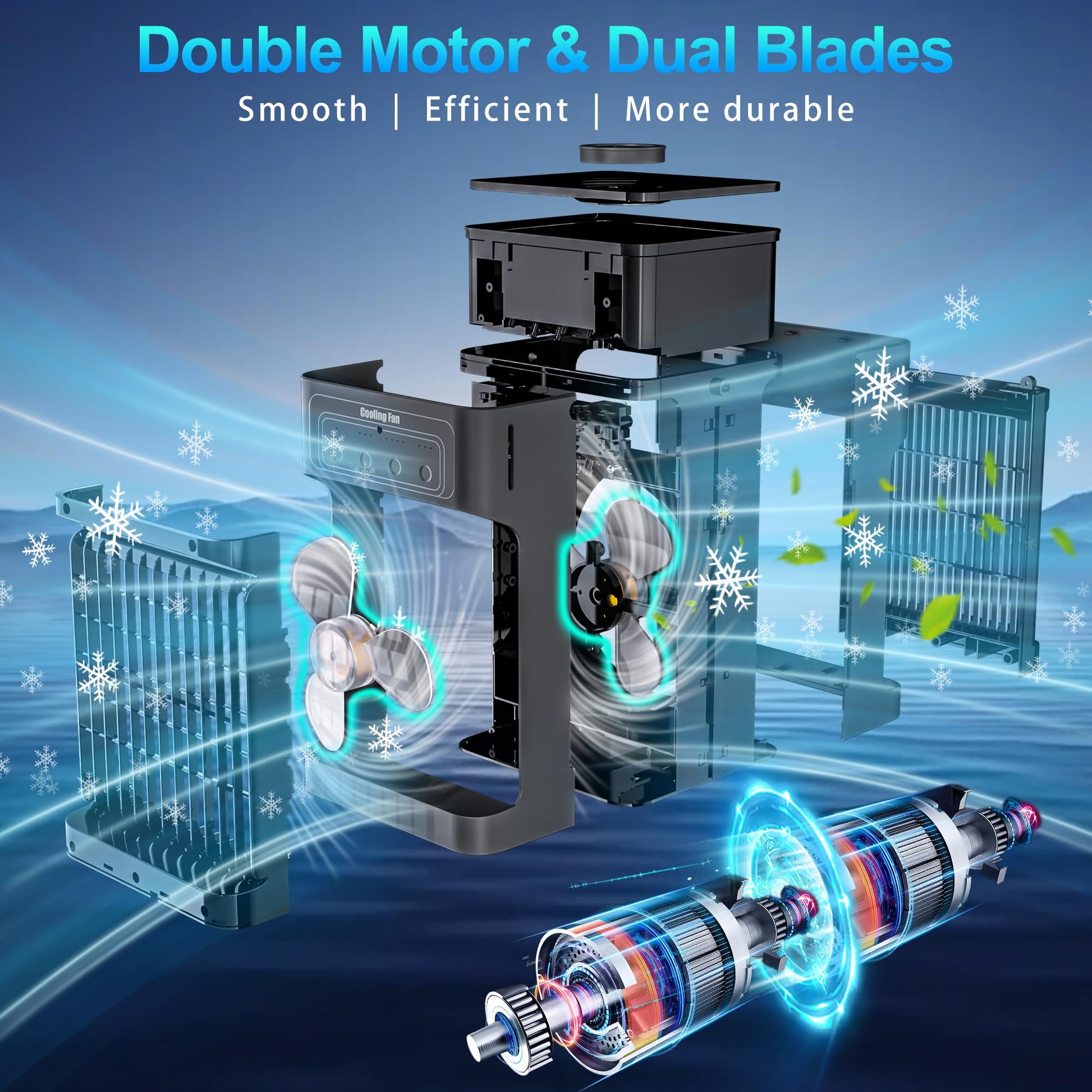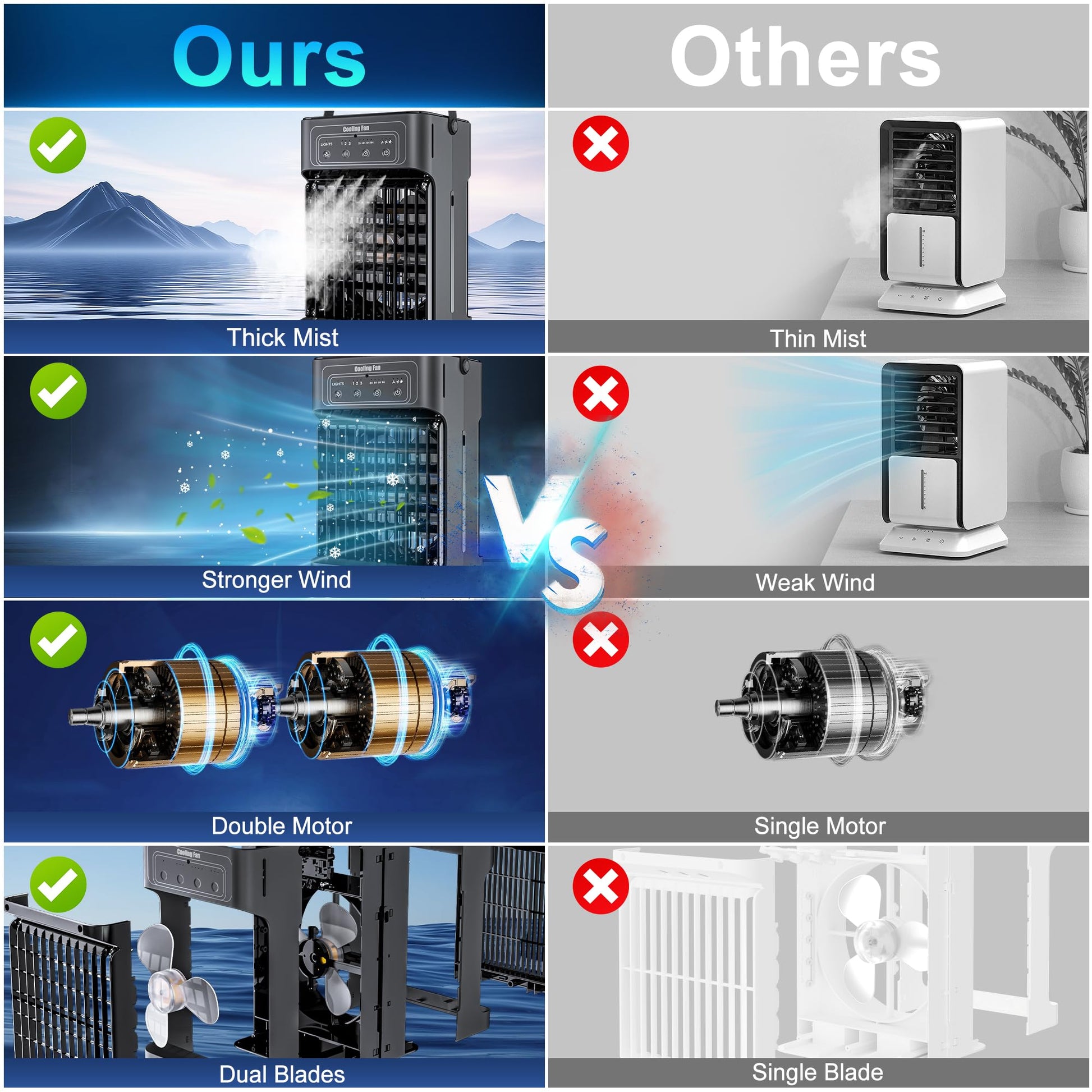 - 【1100ML EXTRA-LARGE WATER TANK】No more constant refills! With a 39oz water tank, our air conditioner offers up to 10 hours of continuous cooling on a single fill. Fill it with regular tap water and a few ice cubes for the ultimate chilling experience. This larger tank means fewer interruptions and more relaxation—your oasis is just a fill away!