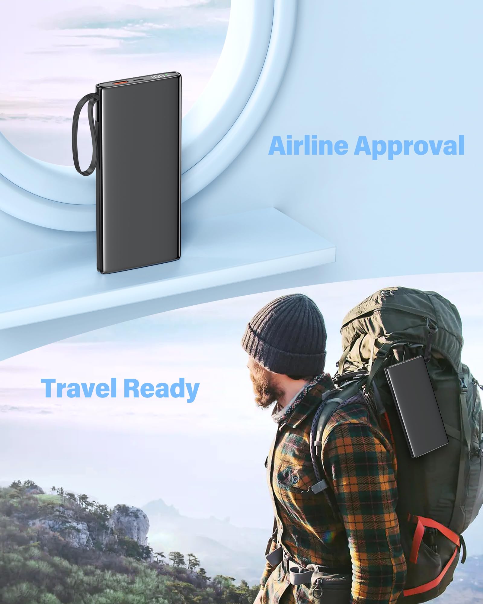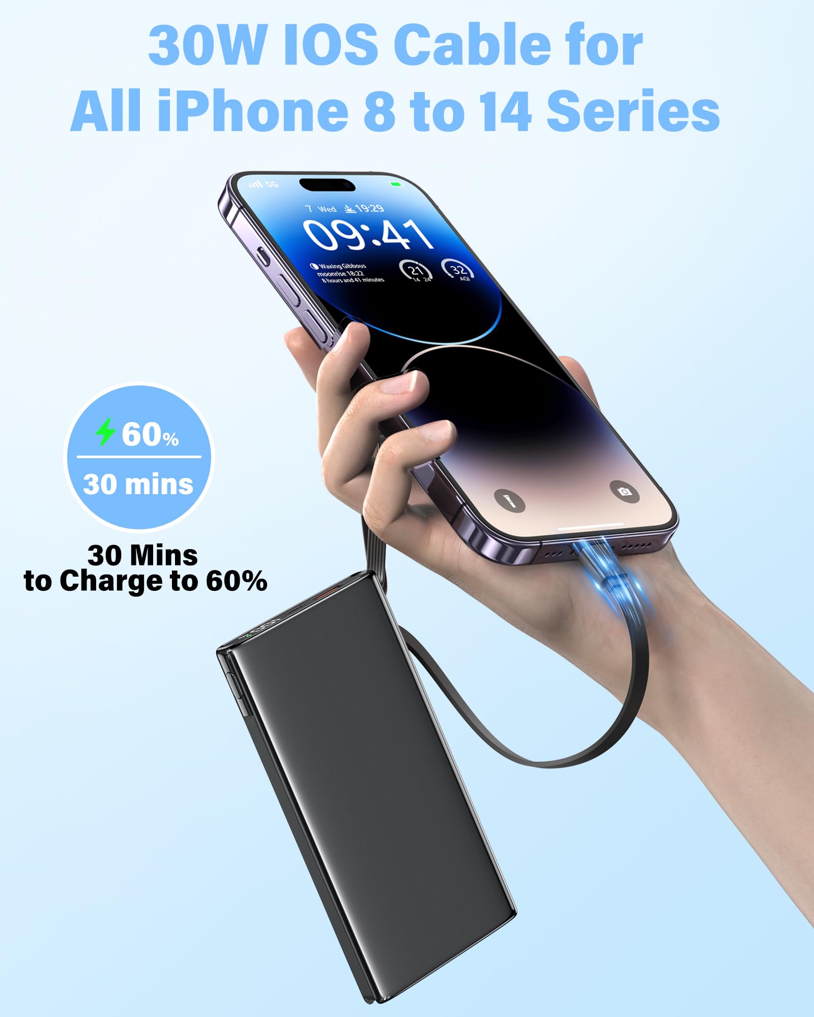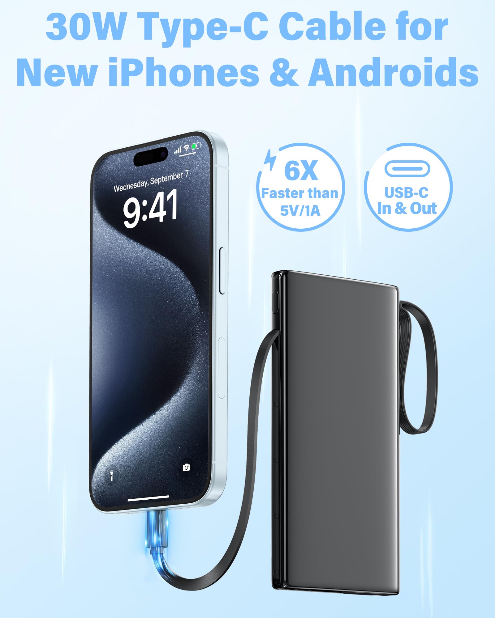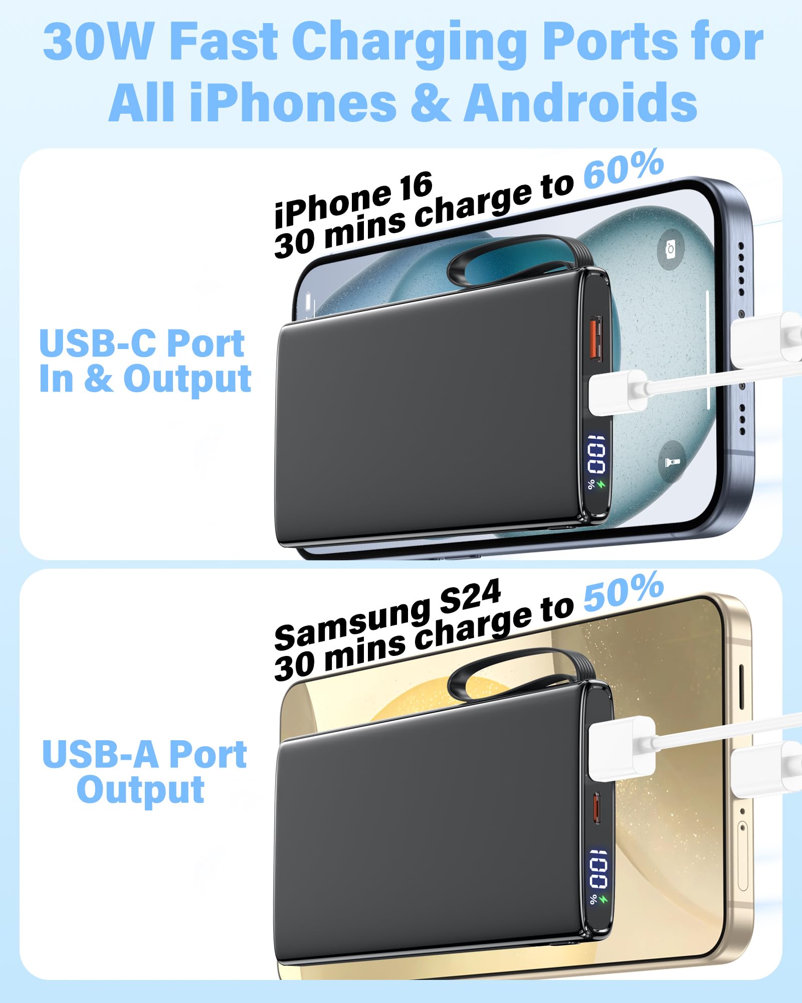 - Built in Faster Charging Cables - This portable battery charger features a USB C In Out port, Also a USB C In Out cable, fast charging for iPhone 15 16 series, Samsung, tablets and all, as well as rapid recharge the portable battery bank itself. The IOS output cable fast charging for iPhone 8 to 14 all series. No need to carry any cords when going out.
