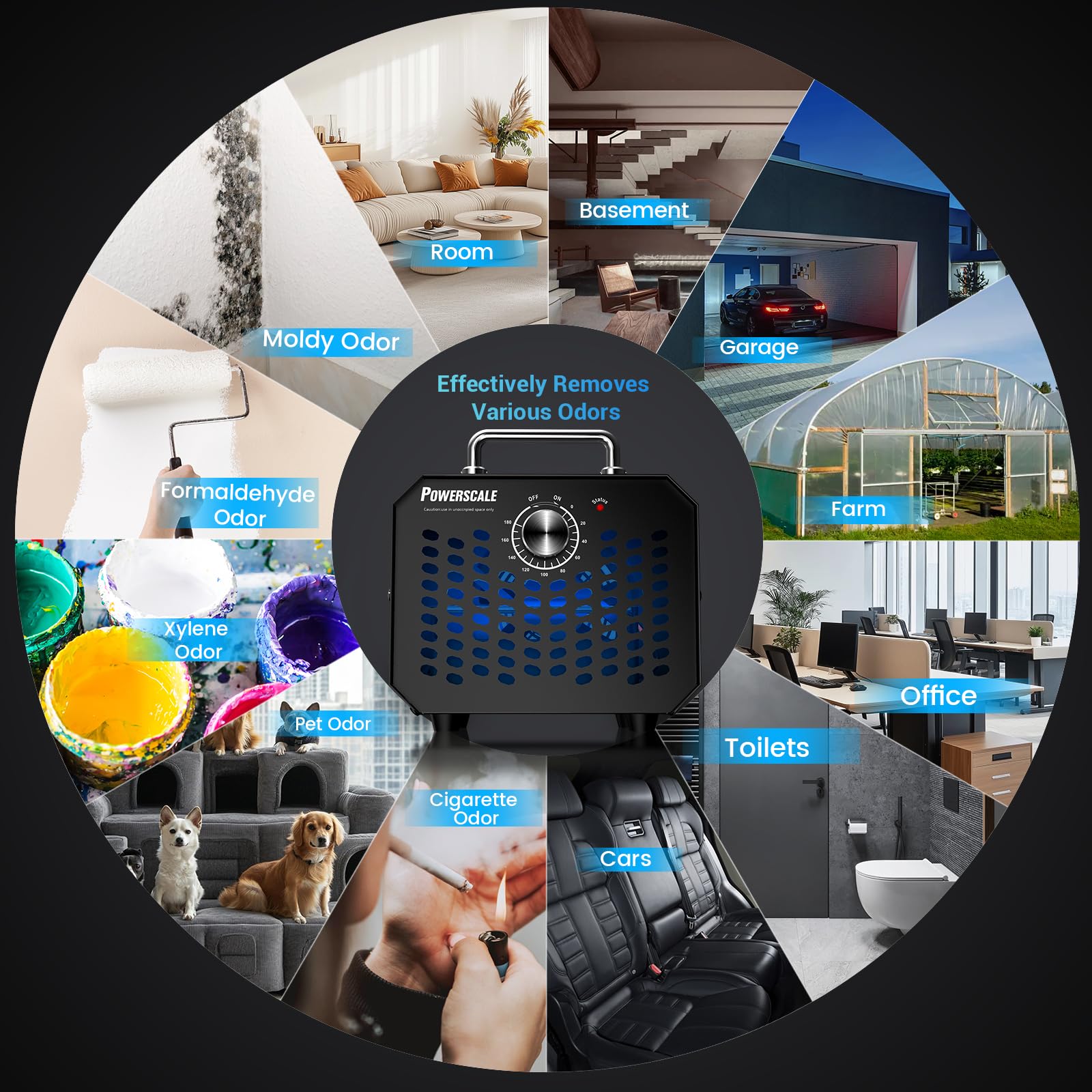 - POWERFUL OZONE OUTPUT FOR EFFECTIVE ODOR REMOVAL: The ozone generator provides an impressive 60,000 mg/h of ozone output, making it a highly effective ozone odor eliminator for removing tough odors like smoke, pet smells, cooking odors, and more. It also helps eliminate mold, mildew, and formaldehyde from renovated spaces and new furniture. With EPA certification, this ozone machine ensures reliability and safety for your home, car, and commercial spaces