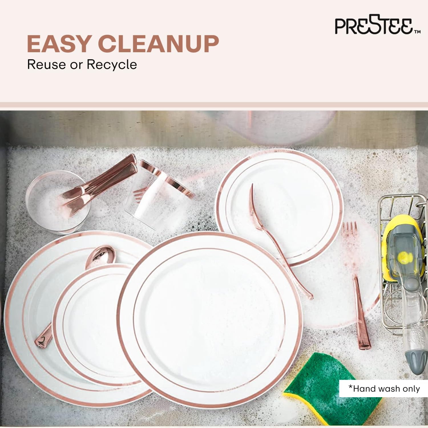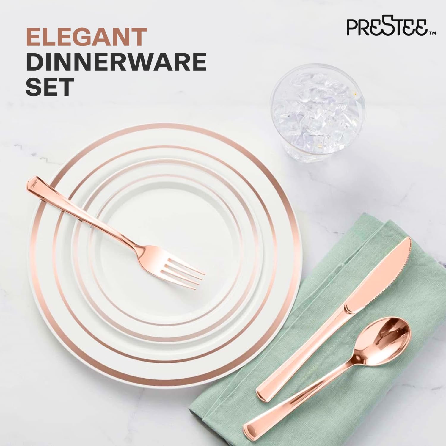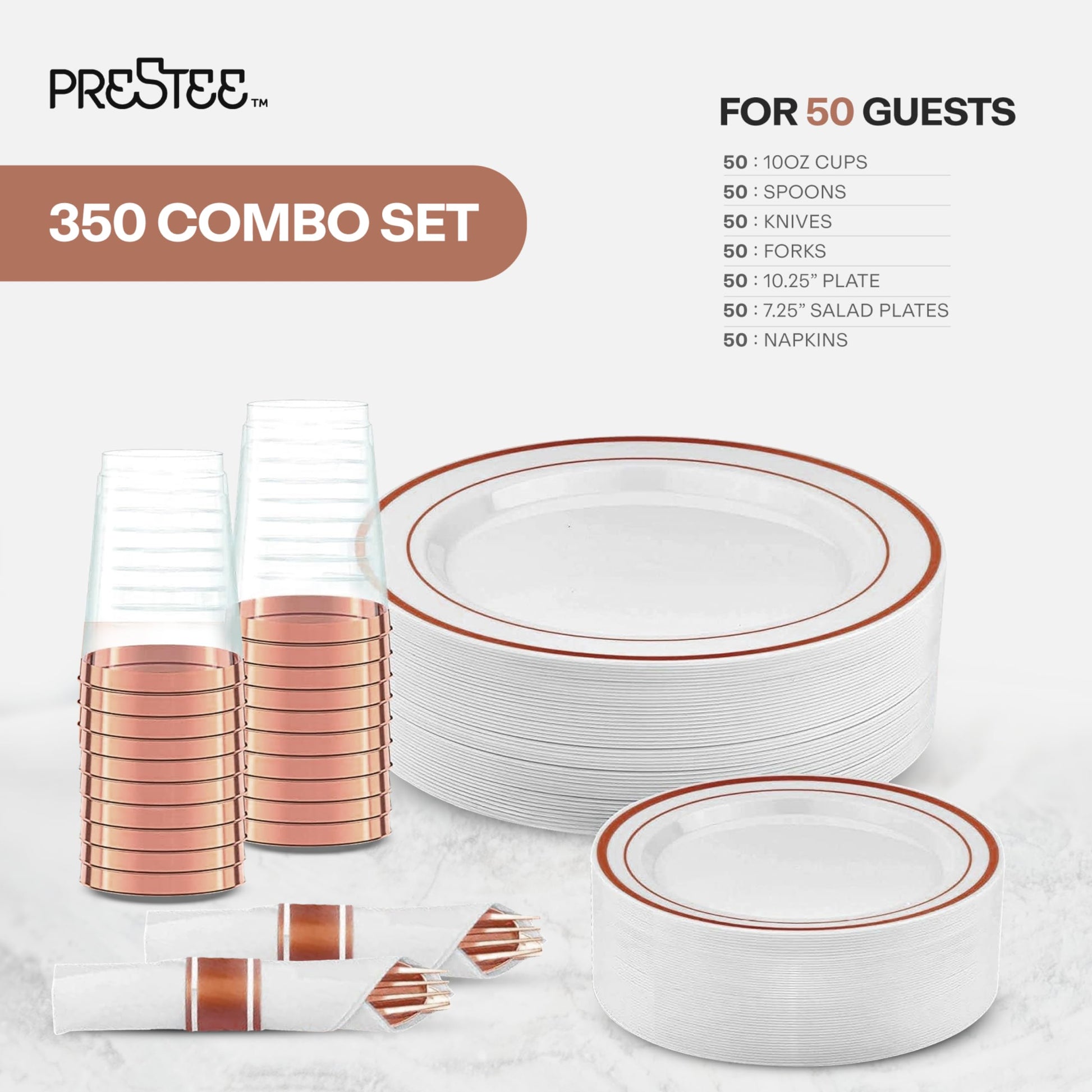 Prestee 350 Pc Disposable Dinnerware Set for 50 Guests - Rose Gold - Reusable Party Supplies Set incl. 50 of Dinner Plates, Salad Plates, Knives, Forks, Spoons and Cups, Wedding Reception Supplies