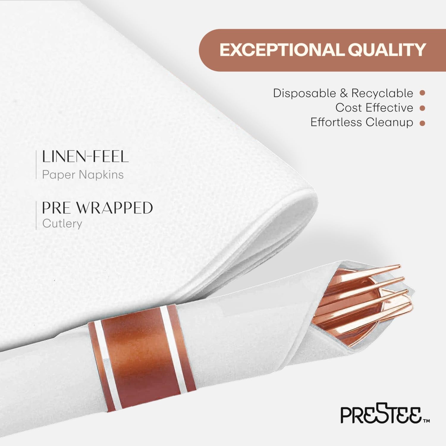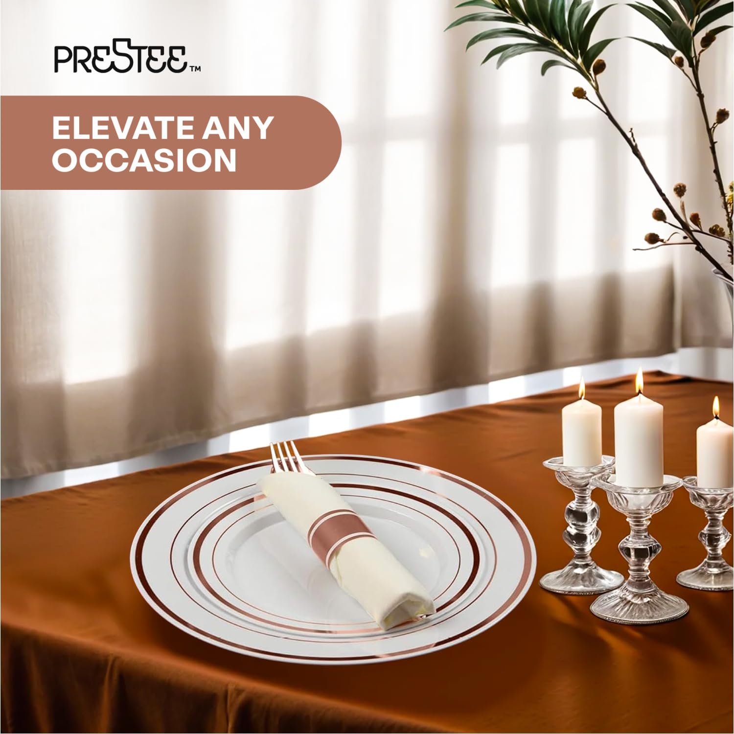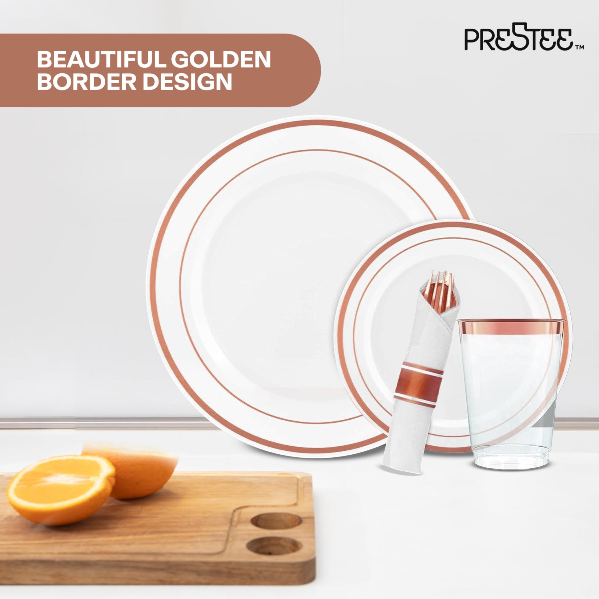 Prestee 350 Pc Disposable Dinnerware Set for 50 Guests - Rose Gold - Reusable Party Supplies Set incl. 50 of Dinner Plates, Salad Plates, Knives, Forks, Spoons and Cups, Wedding Reception Supplies