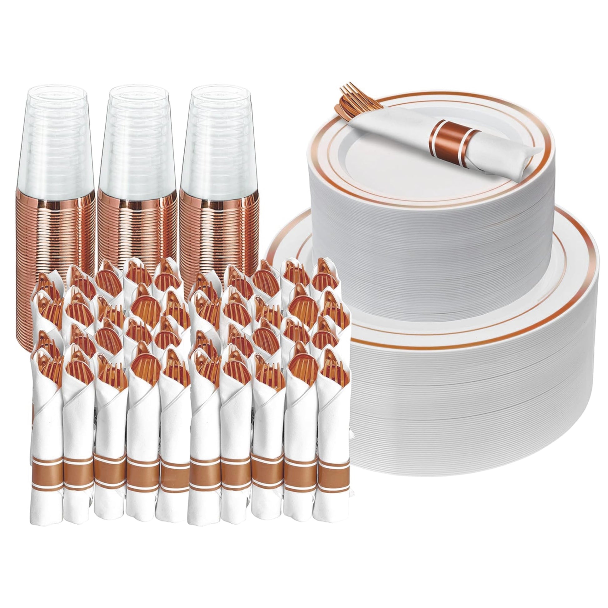 - DINNERWARE & ACCESSORIES - 350 piece party supplies for 50 guests: 50 white plastic plates with rose gold trim, 50 salad rose gold plates, 50 9-oz rose gold plastic cups, 50 knives, 50 forks, and 50 spoons.