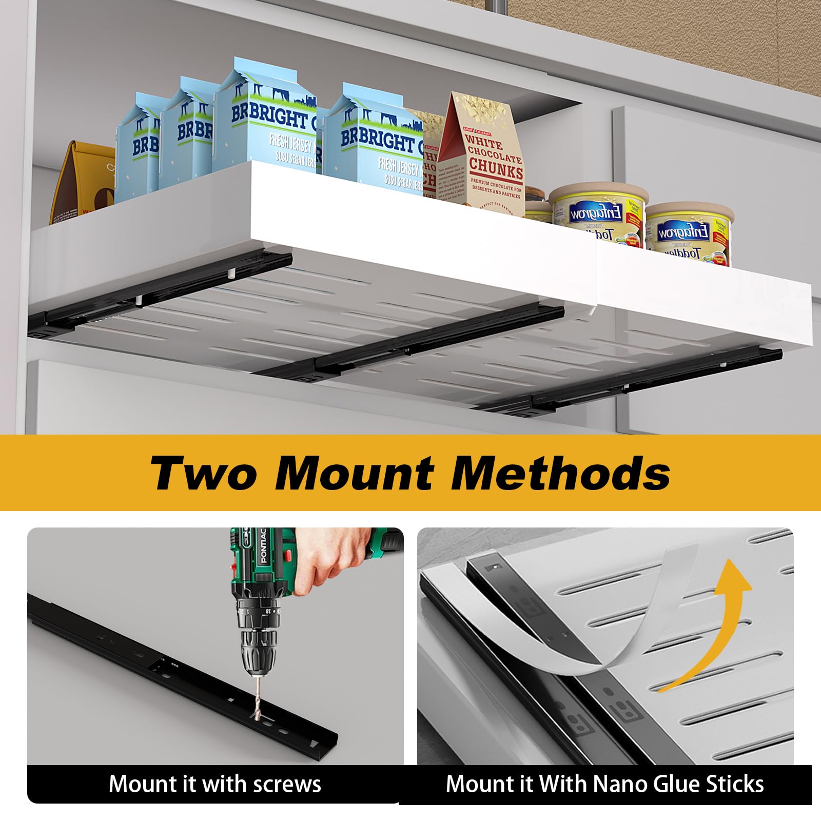- 【Easy to Assemble】The expandable pullout shelf is easy to install with great double sided tape, no drilling needed,please make sure you let the glue stick for a lest 24 hours before mounting.But if you do not want to use the sticky strips, you can use screws to secure it in the cabinet.Tips:It won't work in cabinets that have a lip