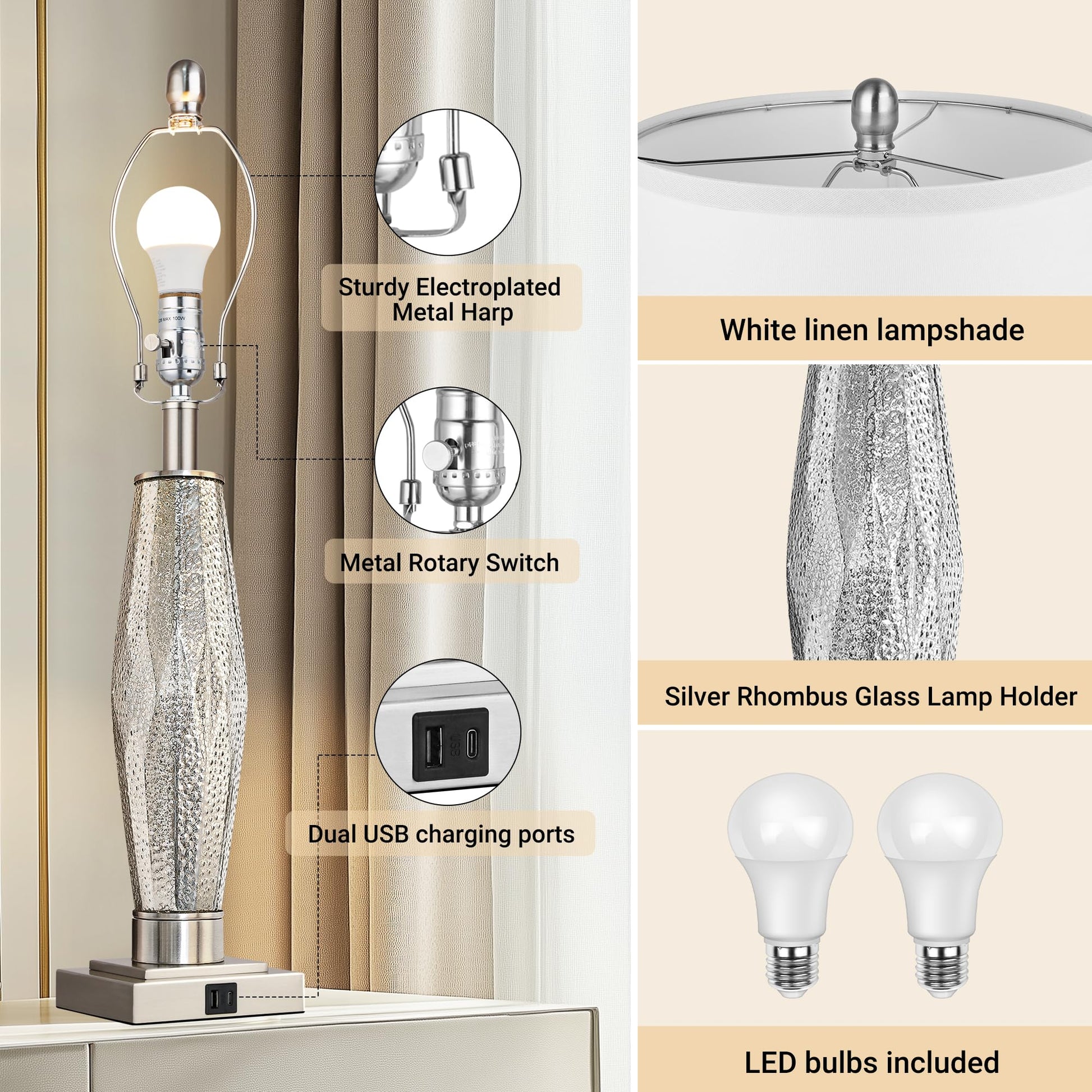 - 【Elegant Tall Table Lamp】: This stunning lamp features glass and brushed nickel metal lamp base. The symmetrical rhombus pattern sits on glass. The bump finish rich the look for a cohesive design. Up top is the flared drum shade that diffuses the soft light, and matching harp and finial complete the look. Add a contemporary feel to any room with these attractive lamps. The lamp for bedroom is an ideal pick for your entryway console table, bedroom and living room accent cabinet.