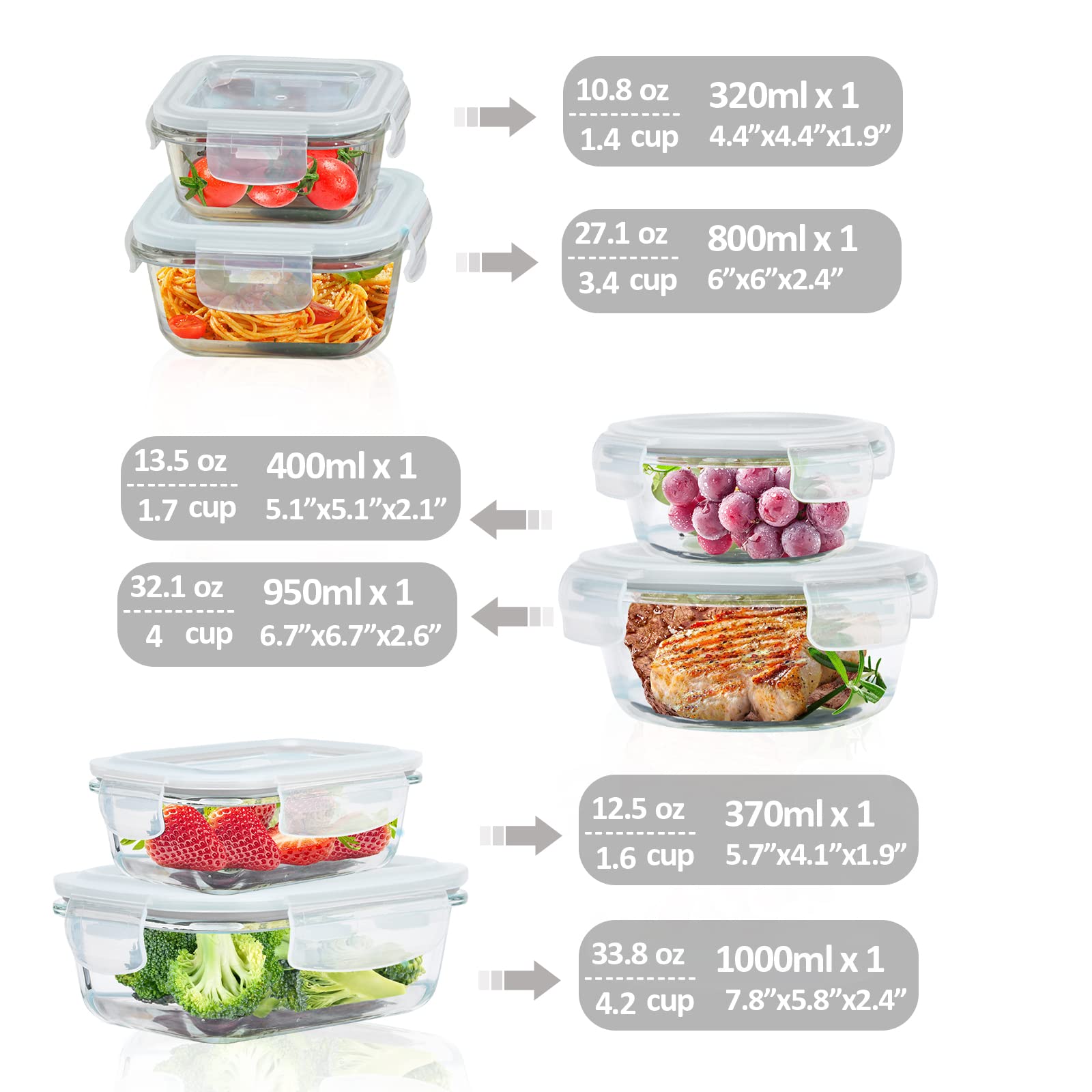 - [12 PIECES GLASS STORAGE CONTAINERS] 6 glass containers & 6 lids, total 3 types and 6 sizes are included in the glass food storage containers set. Rectangle container: 1x370ml & 1x1000ml. Square container: 1x320ml & 1x800ml. Round container: 1x400ml & 1x950ml. Meets different glass food storage needs for daily use.