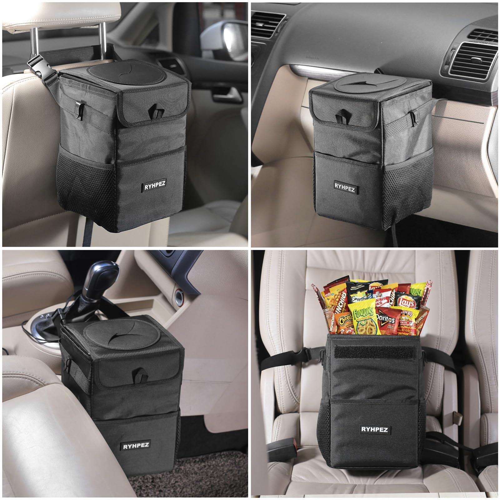 Ryhpez Car Trash Can with Lid - Car Trash Bag Hanging with Storage Pockets Collapsible and Portable Car Garbage Bin