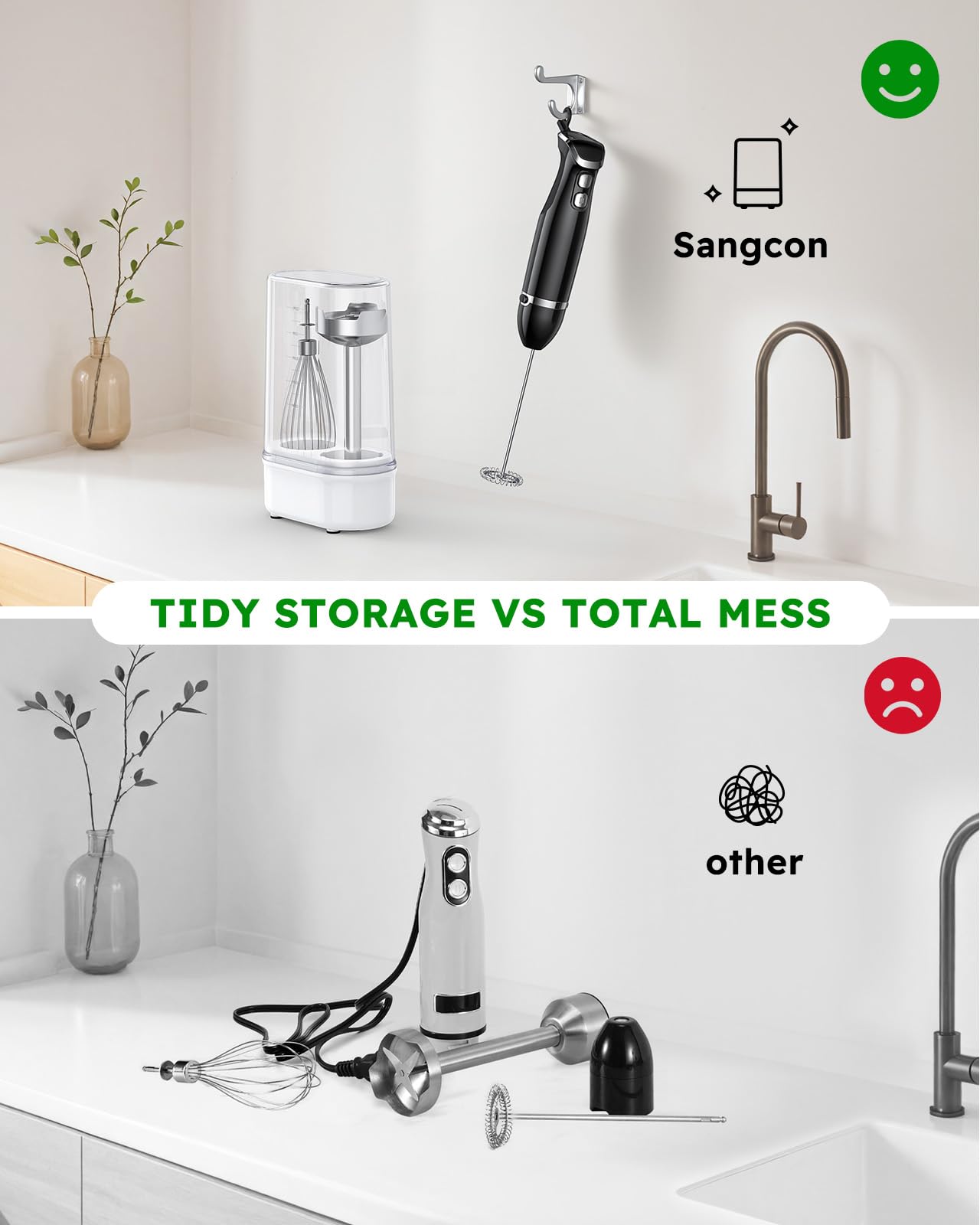 - 【EASY TO CLEAN AND STORE】Sangcon hand mixer electric handheld features a snap-on detachable attachment design, making it extremely easy to clean. The attachments are ETL chemical-free and BPA-free, and are dishwasher-safe (note: the hand blender shaft should be hand-washed, and the dishwasher water temperature should be below 75°C). Additionally, our innovative storage design includes a storage base and measuring cup to efficiently organize attachments