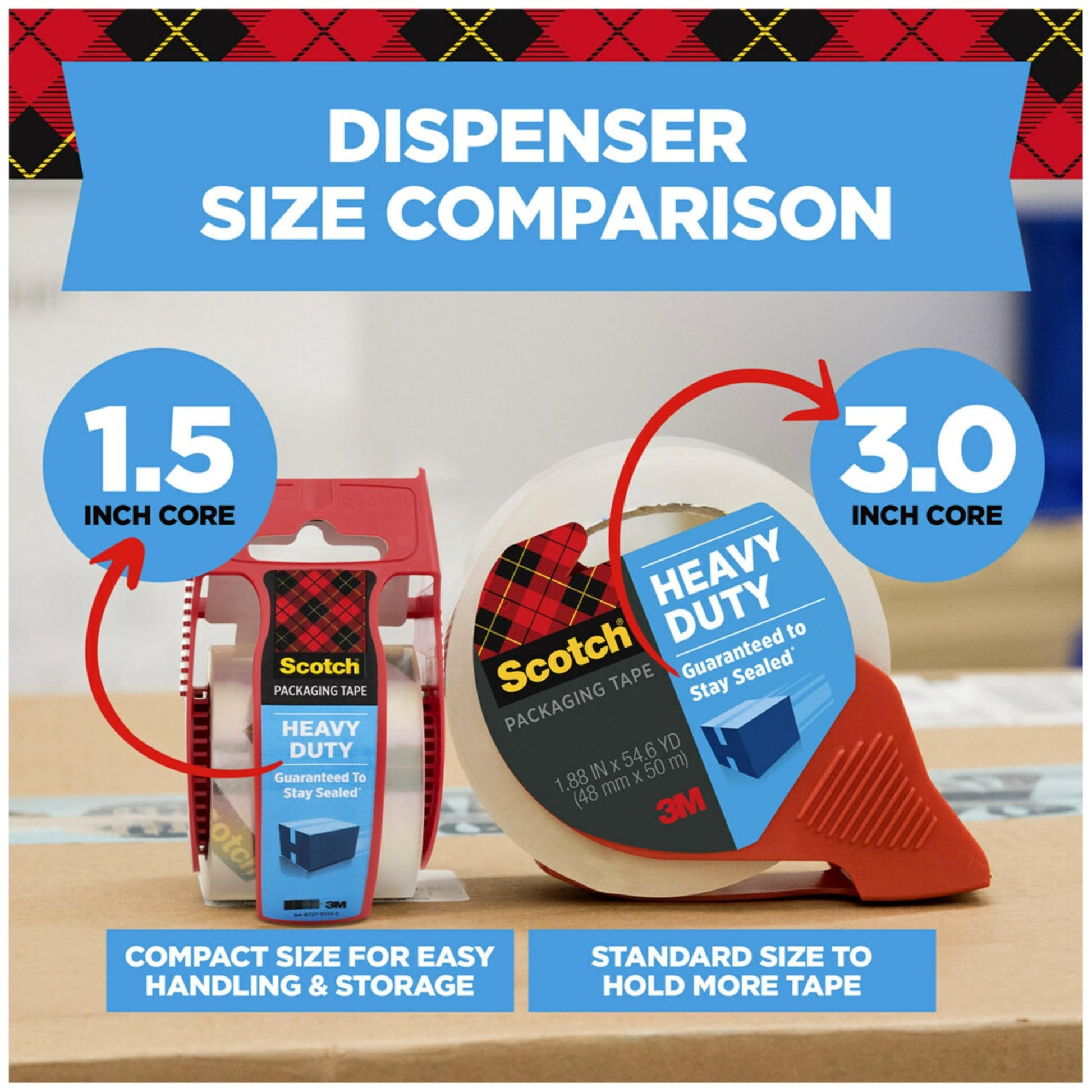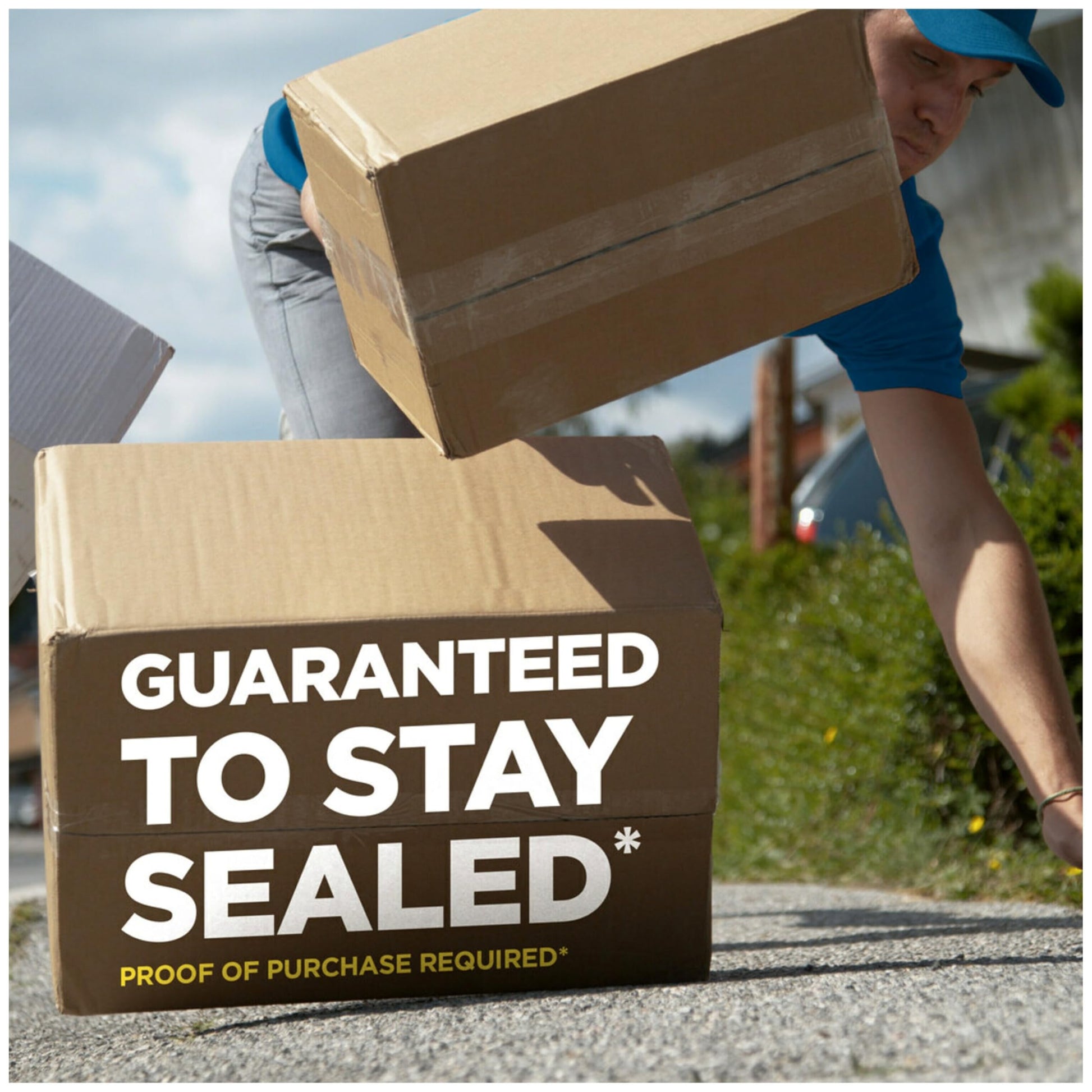 Details: Scotch Heavy Duty Shipping Packing Tape provides excellent holding power for your holiday packaging and shipping needs. This 3.0-mil thick (typical) box sealing tape holds strong on all box types, including harder-to-stick 100% recycled boxes, and is guaranteed to stay sealed (1). Designed with industrial-strength, solvent-free adhesive, this tape locks in the heavy-duty contents of your boxes and locks out everything else, even through rough handling conditions. Scotch Heavy Duty Shipping Packing Tape features instant adhesion and resists slivering, splitting and tearing to keep your moving boxes closed. Whether you're shipping Christmas presents or packing away your holiday decorations, this adhesive tape is equipped to keep your boxes sealed with just one strip on each seam. Each roll of box tape features a release coating to make unwinding easy and comes in a convenient dispenser that makes application a breeze. Fall-back tabs on the dispenser help ensure the tape doesn’t fall back on the roll, keeping it ready for the next use. (1) If your box does not stay sealed, 3M will refund the purchase price of this tape. Proof of purchase required. Contact: 1-800-3MHELPS (2) Typical Value
