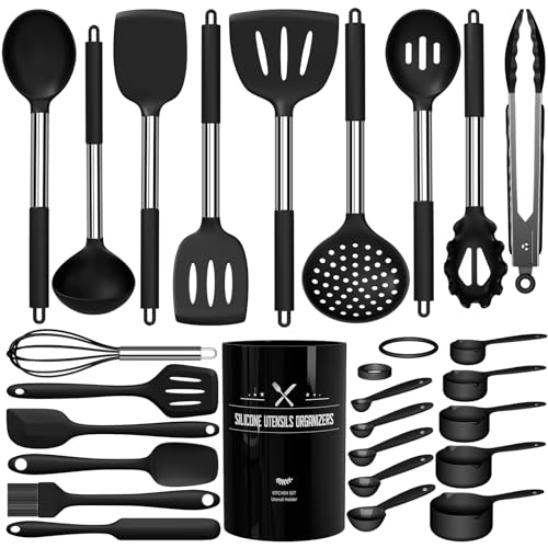 Silicone Kitchen Utensils Set, Umite Chef Large Heat Resistant Cooking Utensil, 26Pcs Silicone Spatulas Set, Stainless Steel Handle, Black Kitchen Gadgets Tools Set for Nonstick Cookware