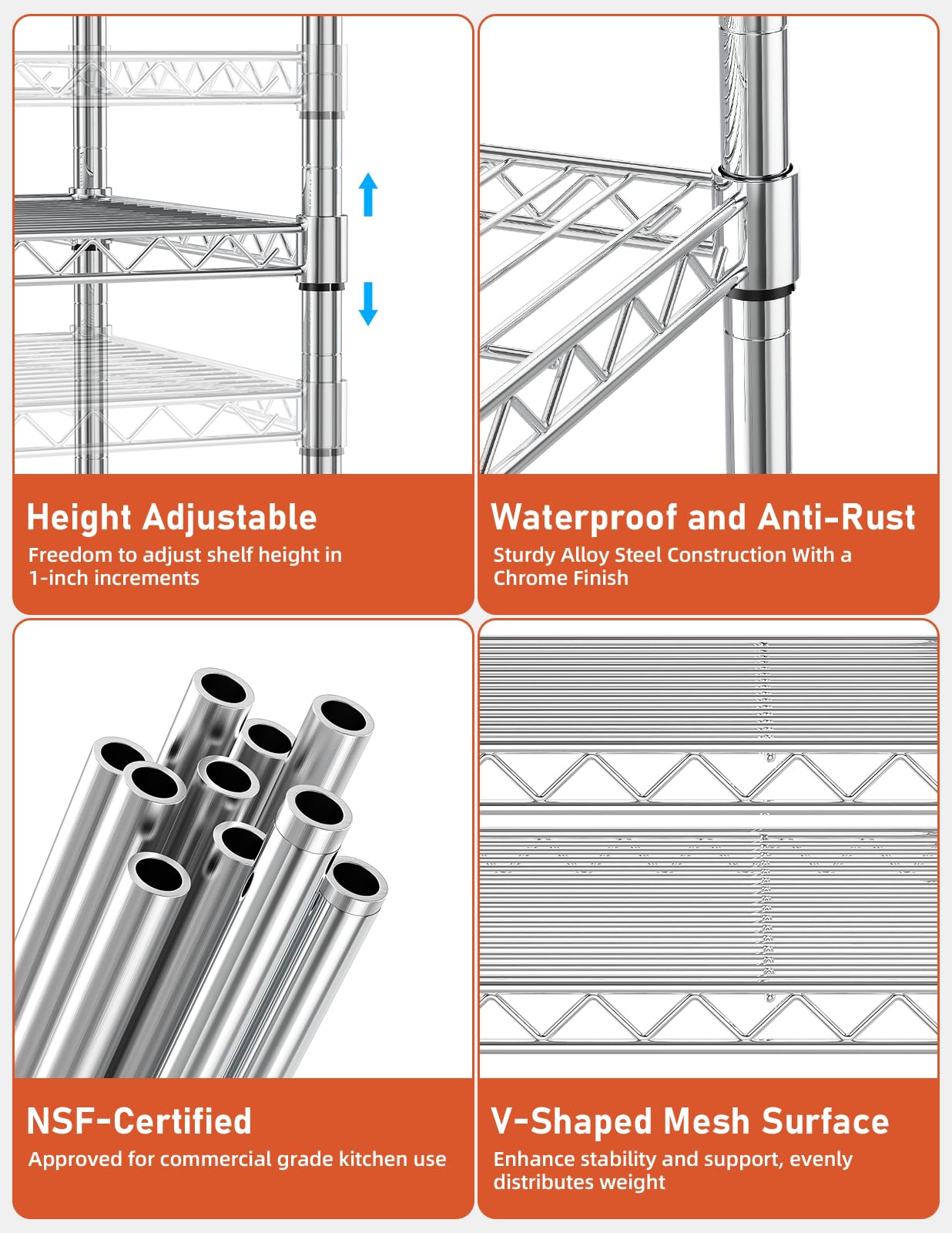 - Freedom to adjust shelf height in 1-inch increments; 4 leveling feet to keep the unit stable; 4 caster wheels for easy maneuvering