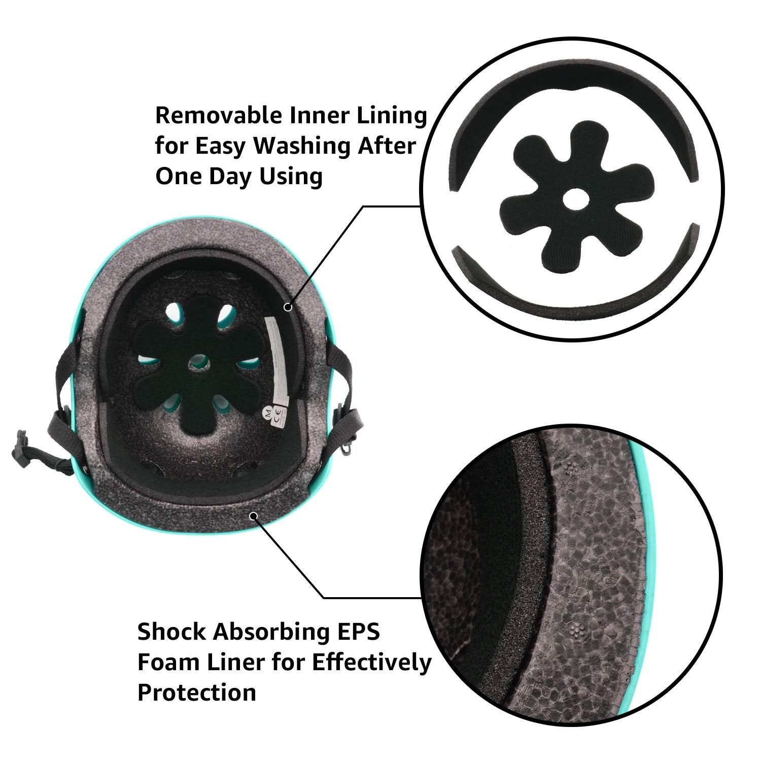 - Well Made and Comfortable to Use.The Skateboard helmet is made of ABS outer shell, durability and protection; EPS liner with inner foam pads for a comfortable fit. Adjustable chin strap with side release buckle