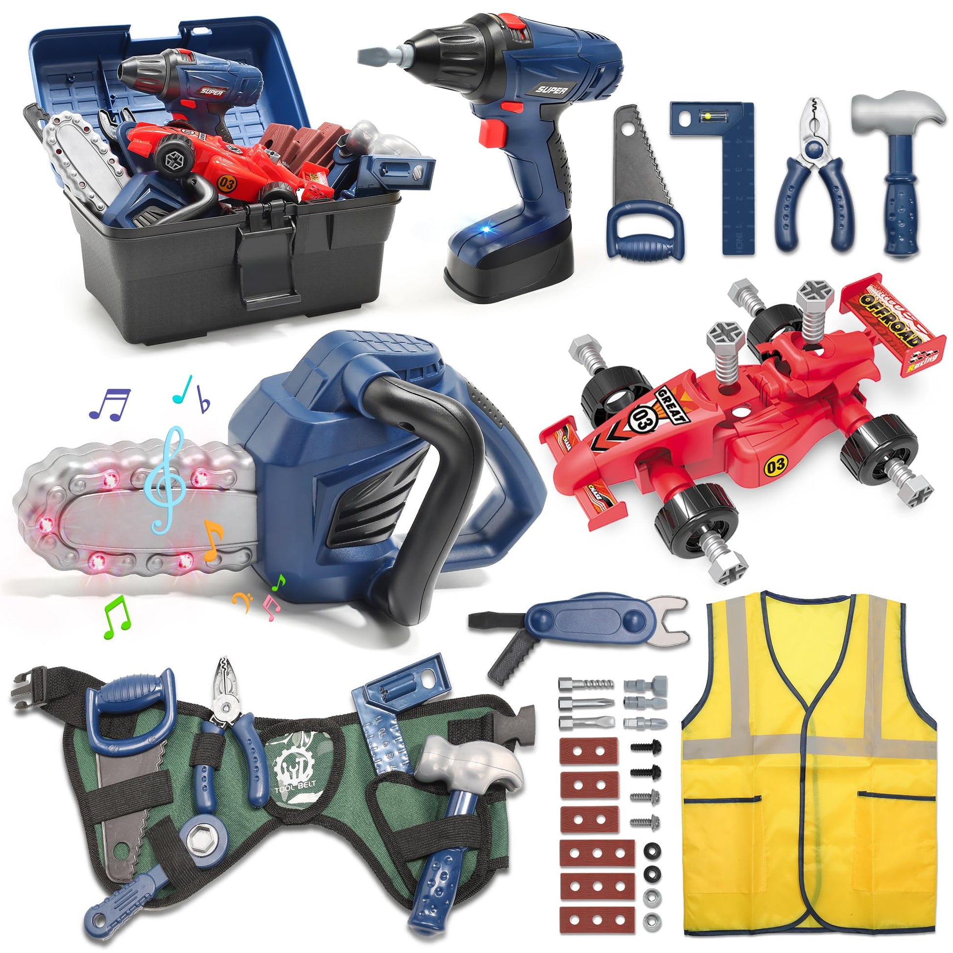 - 🔧 [All IN 1 KIDS TOOL SET]-Toddler tool set just like daddy’s toolkit, this 47 pcs kids construction tool kit includes 1* tool box, 1*electric power toy drill, 1* toy chainsaw, 1*kids working overalls, 1* adjustable tool belt, 1* toy car, realistic hammer, screwdrivers, knife toy and a variety of wooden pieces, nails, nuts and more.