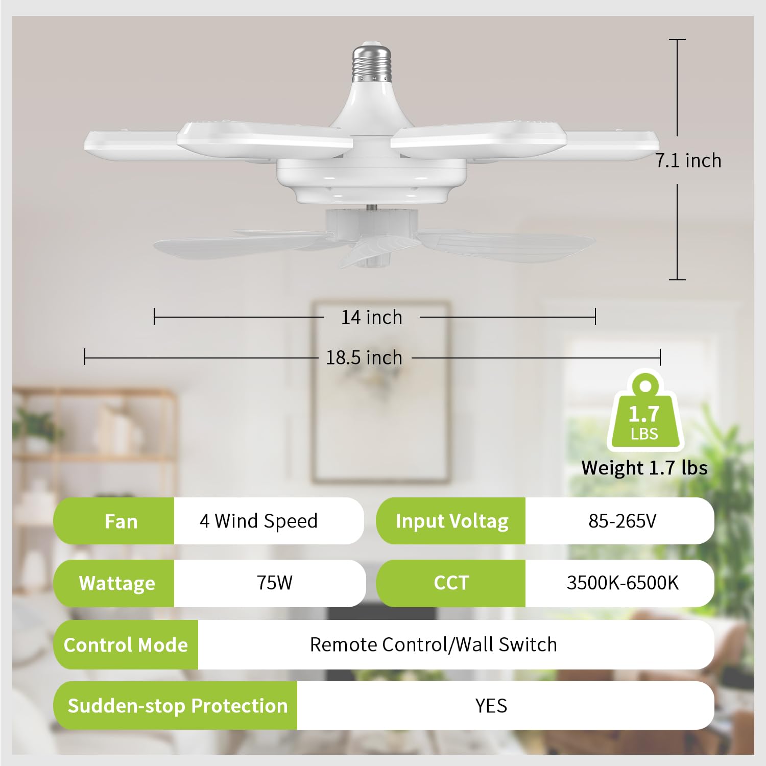 - âď¸ăCompact Size & Distinctive Featuresă: The ACHHAH foldable ceiling fan light with a lightweight design, its product dimensions are 14 x 14 x 7.1" from blade tip to blade tip and weighs 1.7 pound. The flexibile construction of light socket fan offers convenient storage and space-saving benefits, allowing you to effortlessly use or store it as your need, and Easy to detach blade for straightforward cleaning.