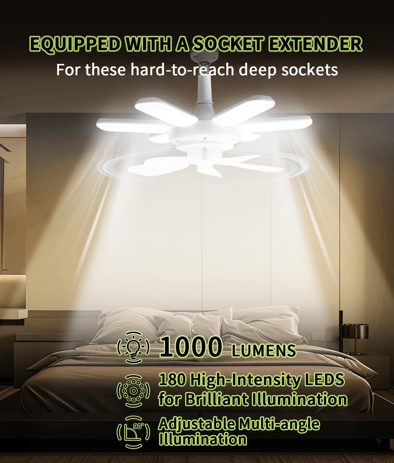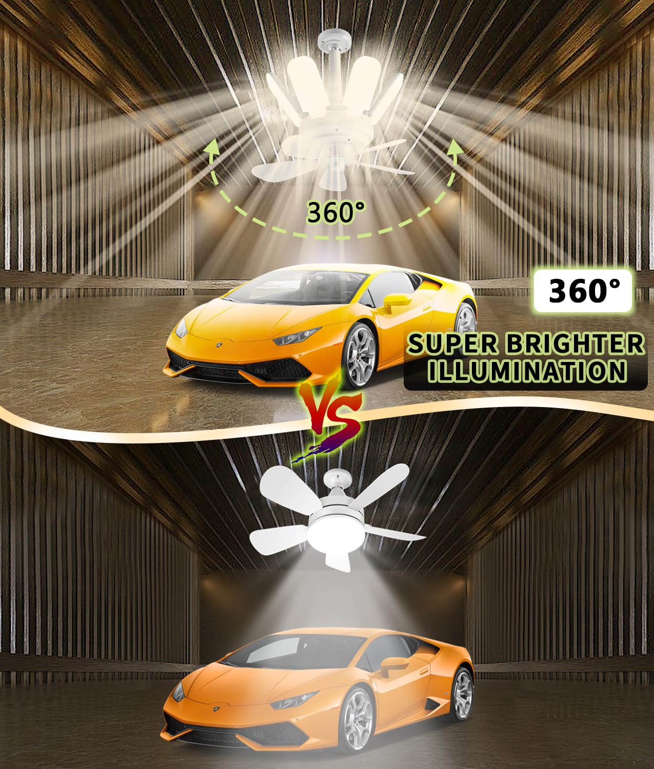 - đĄă360°Super Brighter Illuminationă: ACHHAH ceiling fans with lights and remote, integrates 180pcs high-intensity LED bulbs, produce 1,000 lumens, comes with 6 foldable panels, the best led garage/room ceiling lights can be adjustable from 0 to 90 degree, which illuminate each corner of your garage/ room in 360 full coverage without visual blind spots and dizziness. The garage light fan will provide better light than 3, 4 and 5 led panel garage lights on the market.