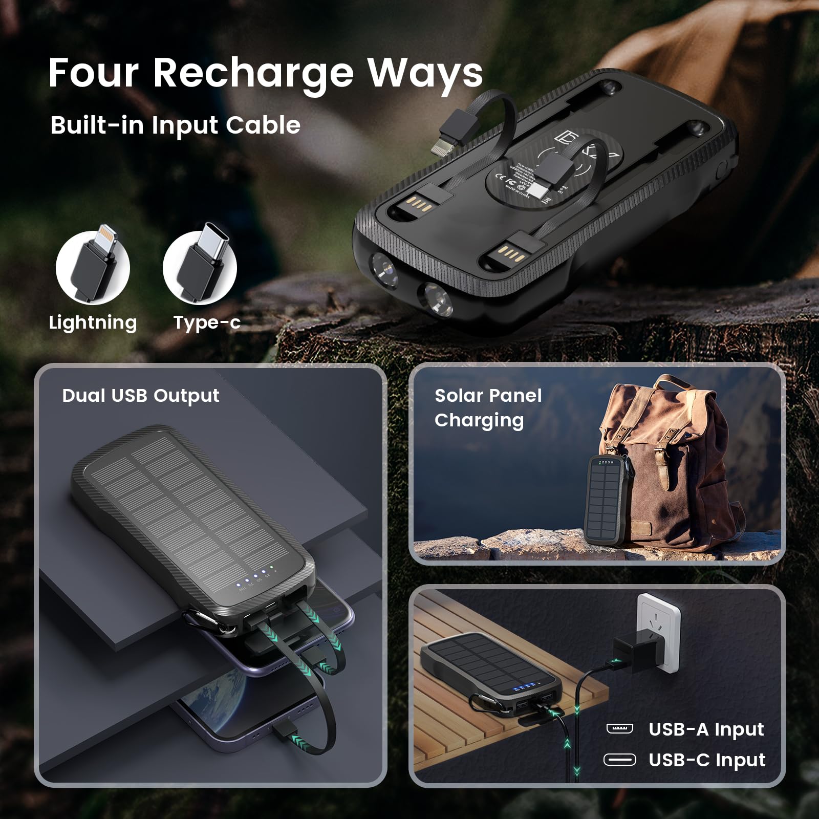 - 【Built-in 2 Charging Cables】This power bank is built with 2 output cables ( USB-C*1 & iOS*1 ) . Get rid of messy cables and charge them anytime and anywhere. Two Charging Ways - An external battery charger with a solar panel can be recharged by solar or outlet. Compatible with your smartphone's Camera, Tablets, and other USB devices. More than 1000+ recharge lifecycles