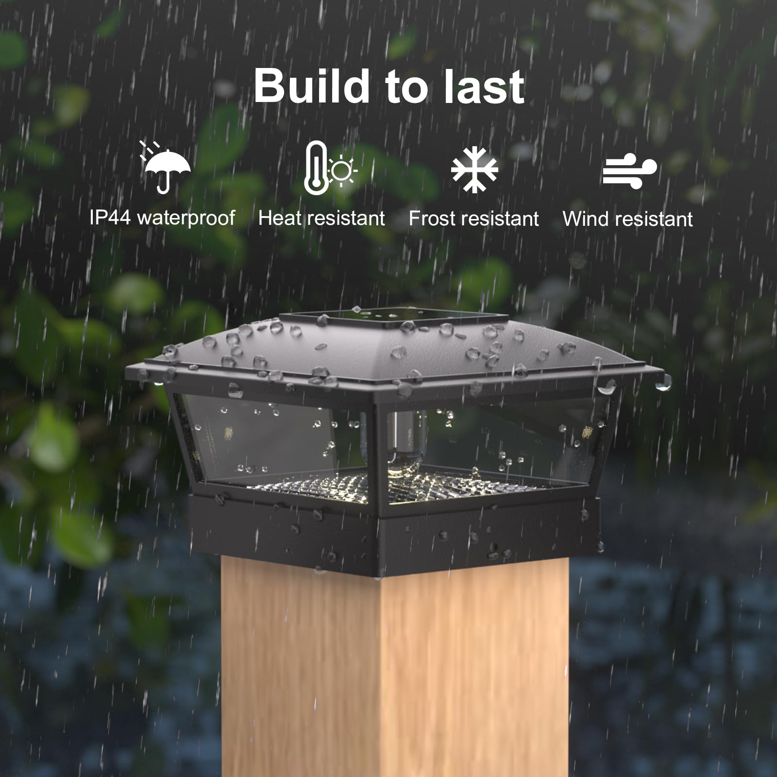 - [Weater Resistant] Solar outdoor lights for fence and deck is made of IP44 waterproof material, which can endure high temperature, heavy rain, wind and snow. Whenever night falls, the waterproof solar powered fence post lights will automatically light up rain or shine.