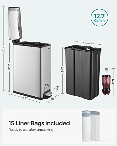 SONGMICS Slim Trash Can, 12.7 Gallon Garbage Can for Narrow Spaces with Soft-Close Lid, Inner Bucket, and Step-on Pedal, Stainless Steel, 15 Trash Bags Included, Silver ULTB510E48