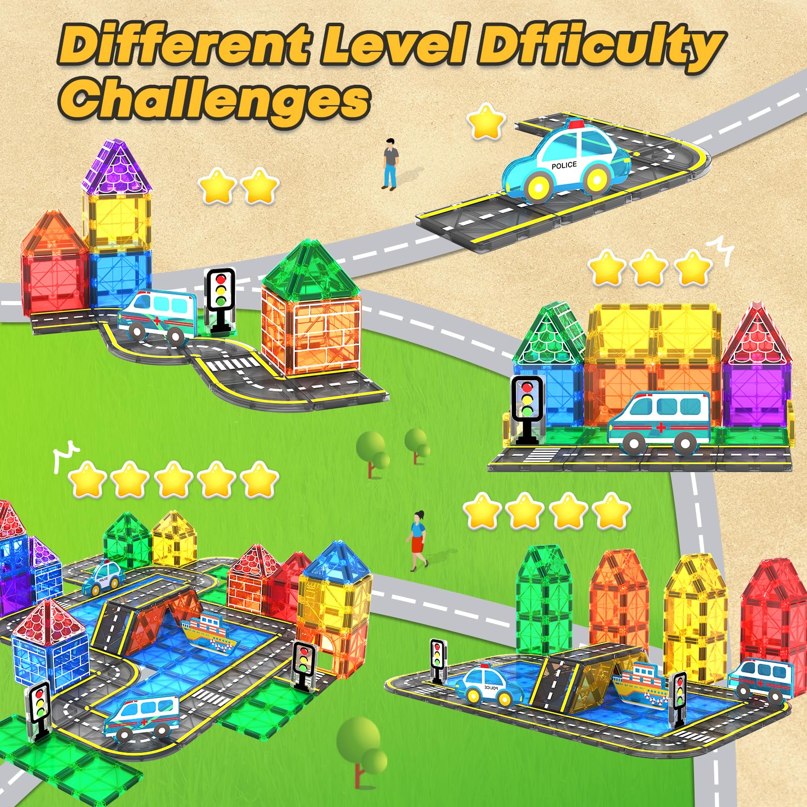- EDUCATIONAL LEARNING TOYS: Magnetic tiles road set can inspire kids' creativity and foster STEM learning and skill development. From problem-solving to spatial cognition, kids can enhance essential skills while constructing dynamic road networks and exploring imaginative scenarios. They'll learn about traffic rules and road safety in a fun and engaging way